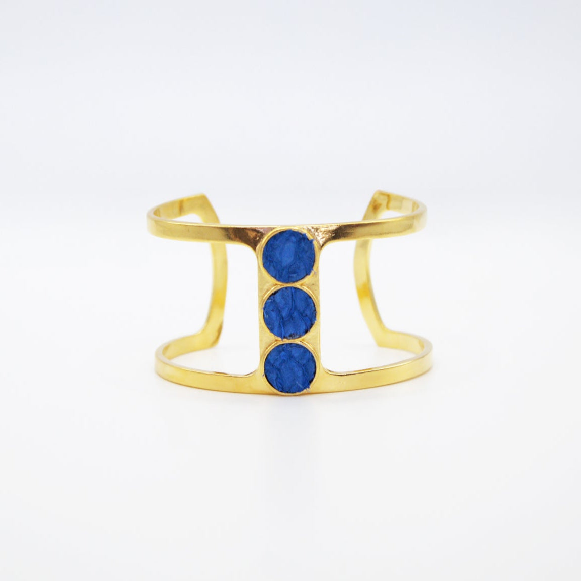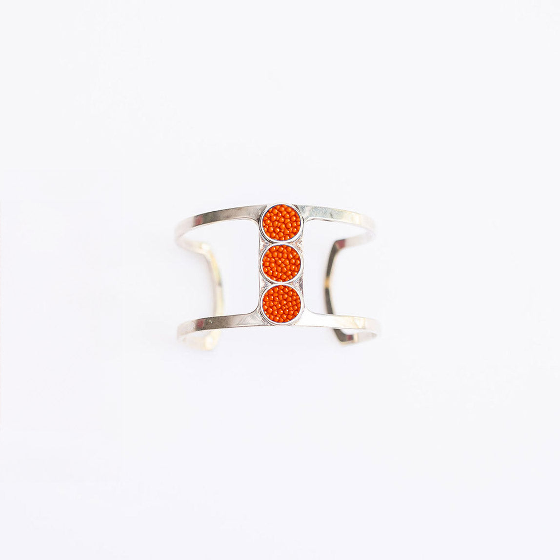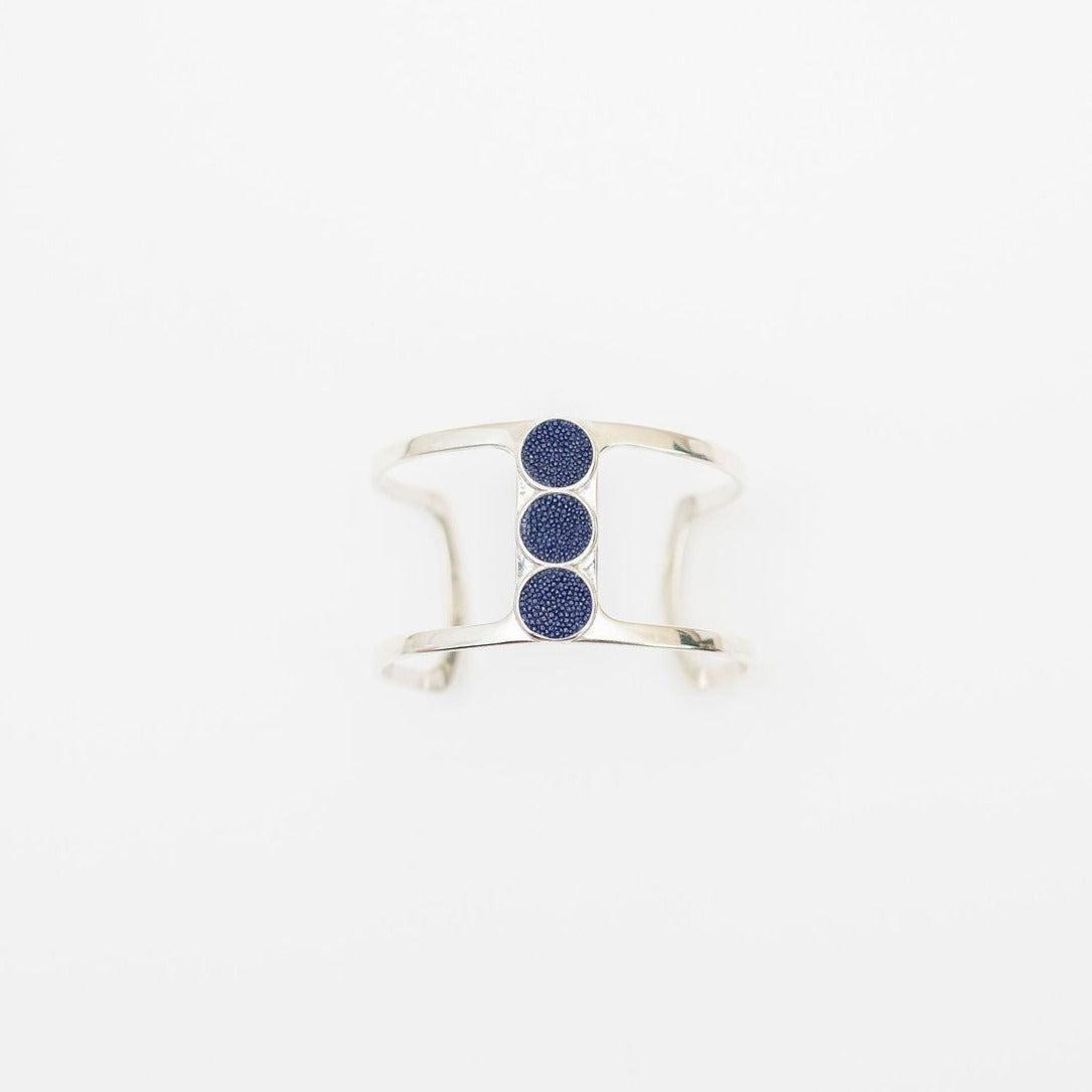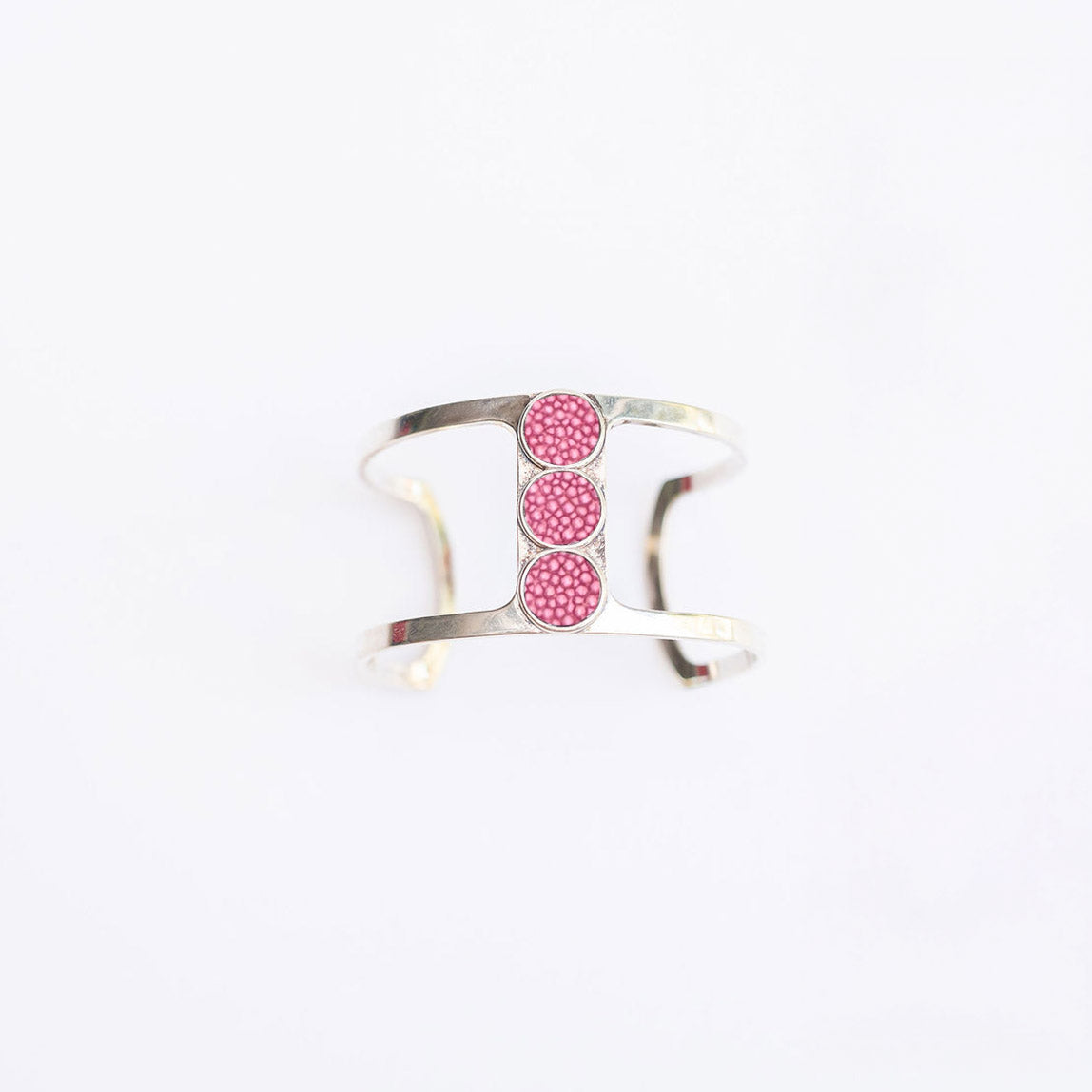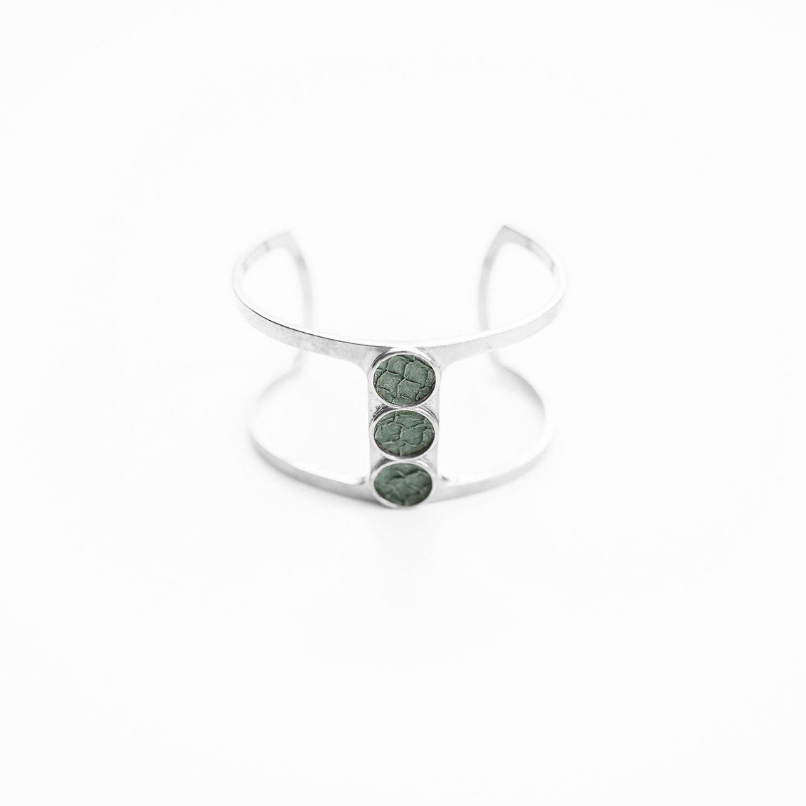 The Toogoodoo Cuff is a uniquely elegant piece featuring three centered bezels adorned with vibrant, colorful fish leather or fish eyes, infusing a hint of personal flair into your outfit.