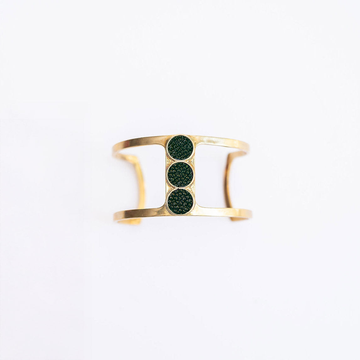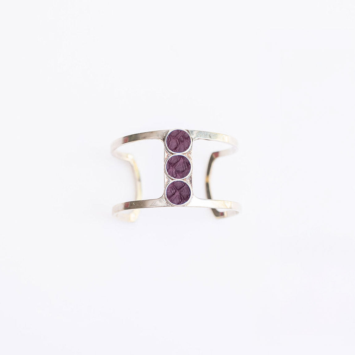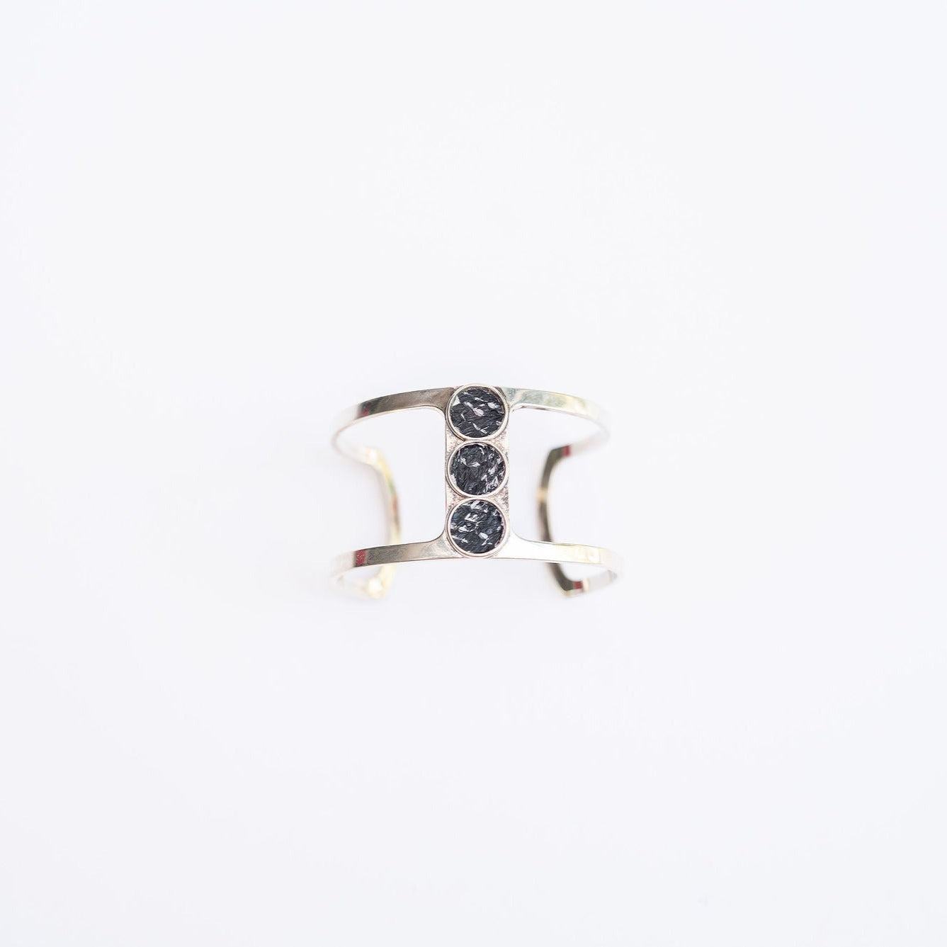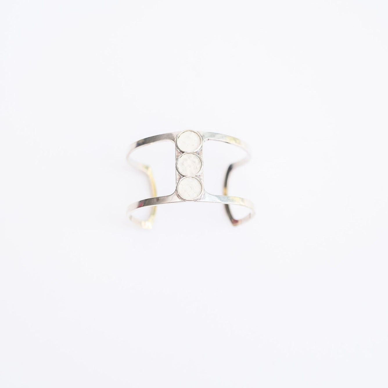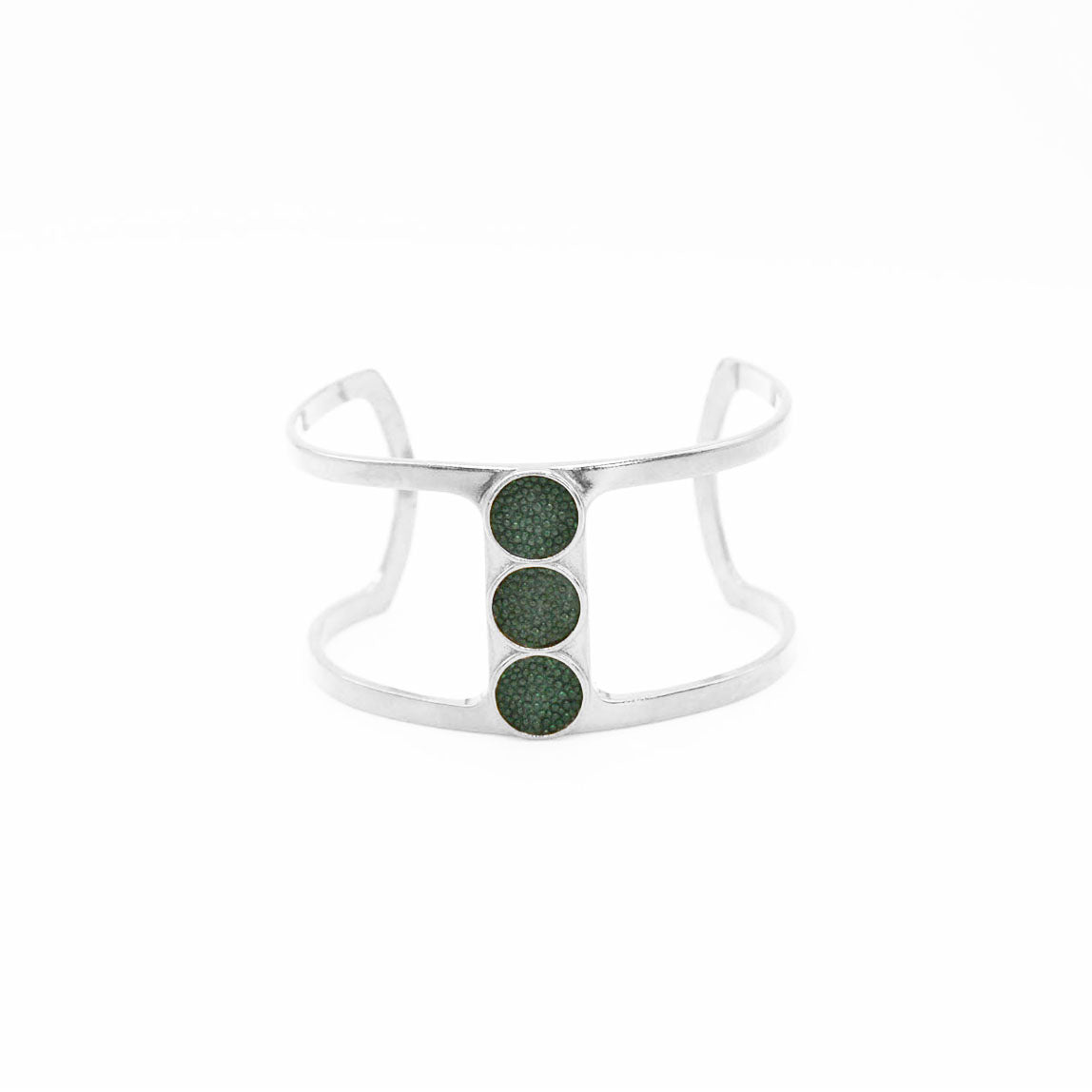 The Toogoodoo Cuff is a uniquely elegant piece featuring three centered bezels adorned with vibrant, colorful fish leather or fish eyes, infusing a hint of personal flair into your outfit.