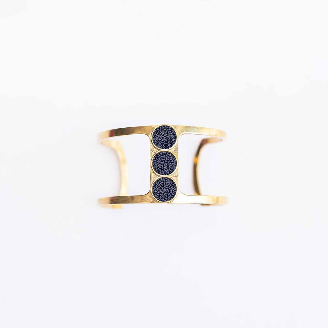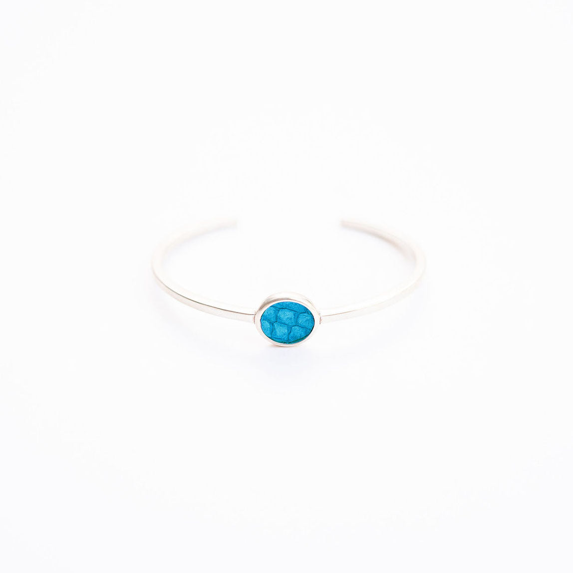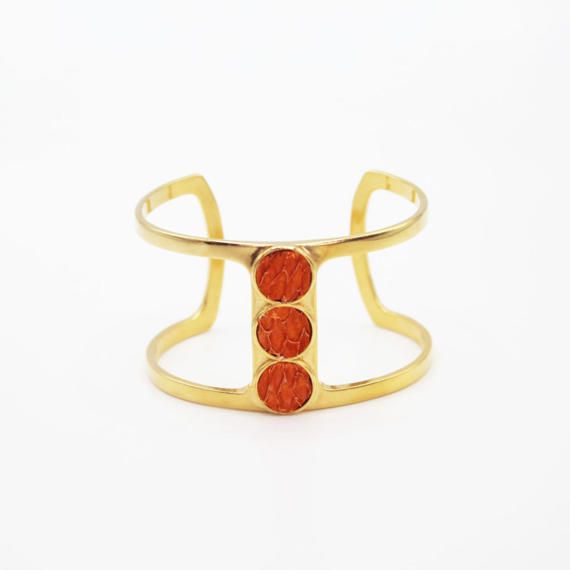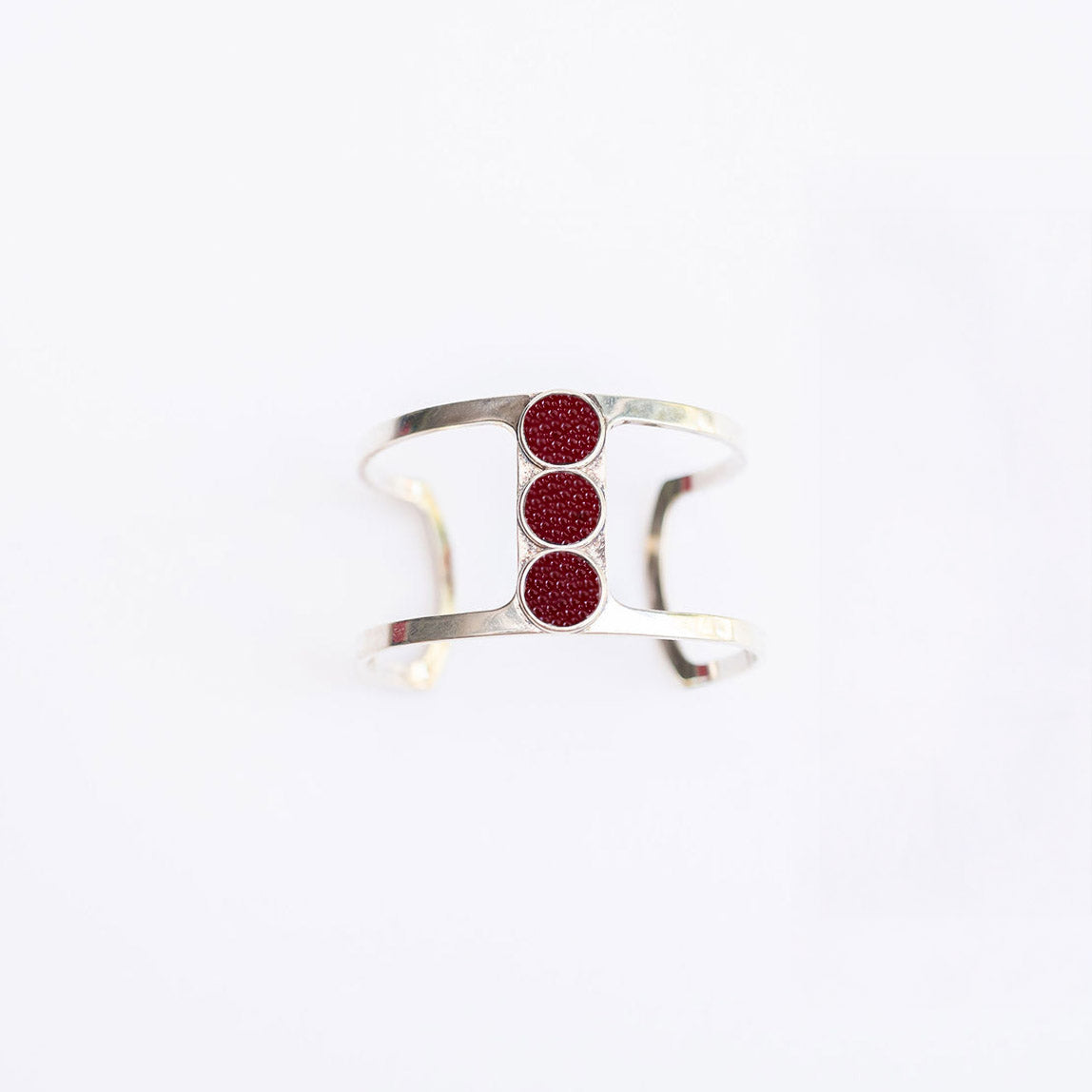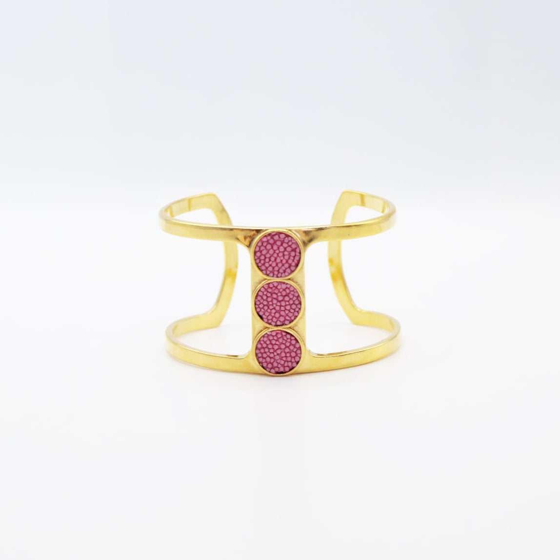 The Toogoodoo Cuff is a uniquely elegant piece featuring three centered bezels adorned with vibrant, colorful fish leather or fish eyes, infusing a hint of personal flair into your outfit.