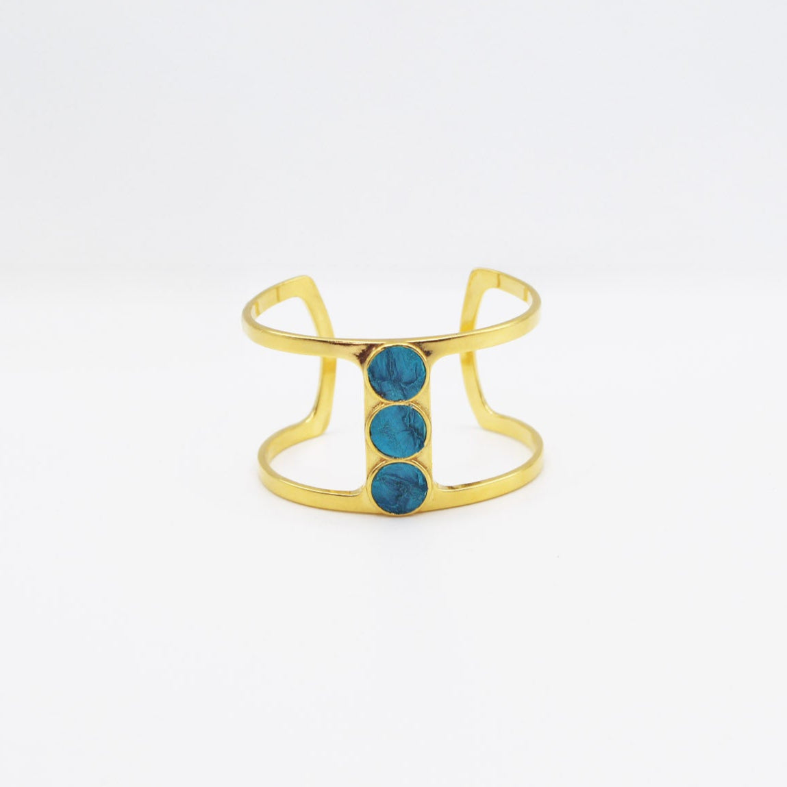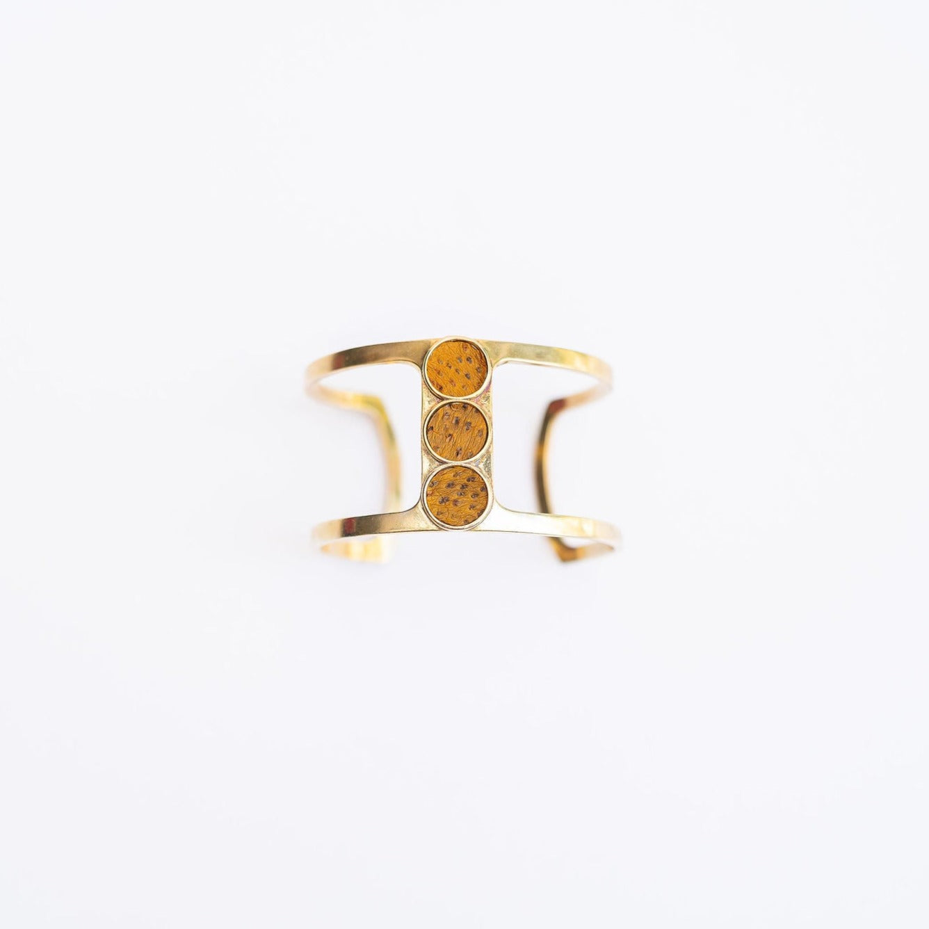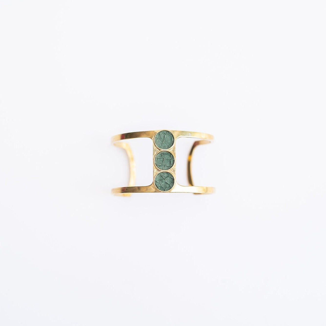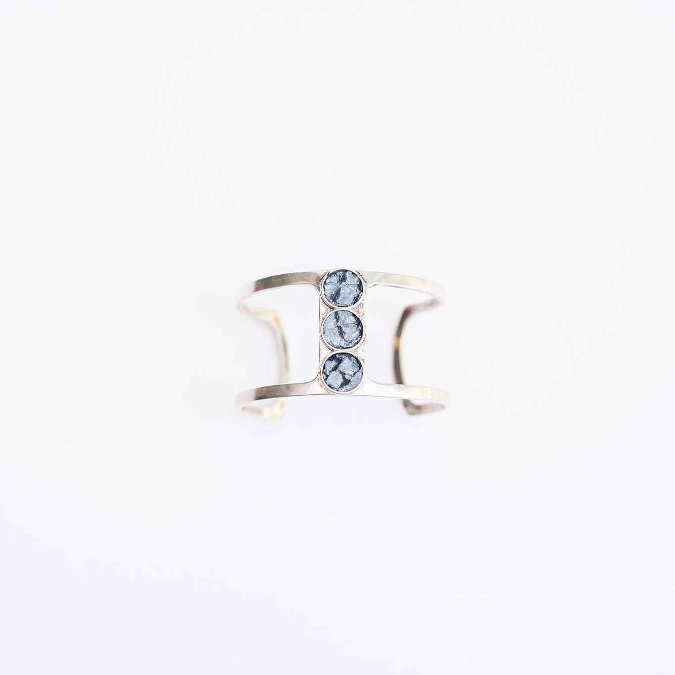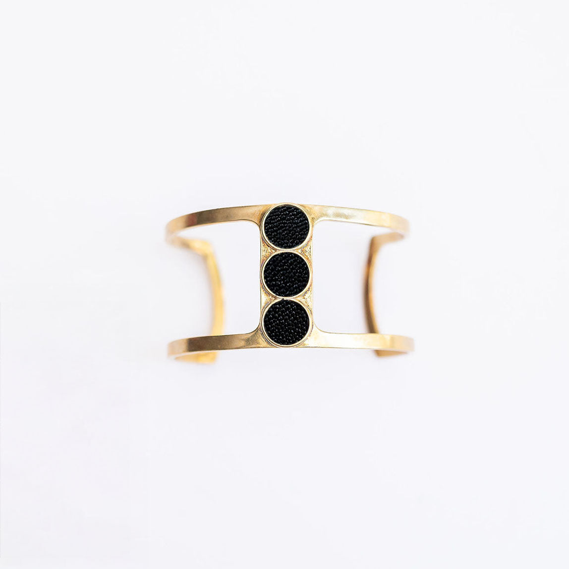 The Toogoodoo Cuff is a uniquely elegant piece featuring three centered bezels adorned with vibrant, colorful fish leather or fish eyes, infusing a hint of personal flair into your outfit.