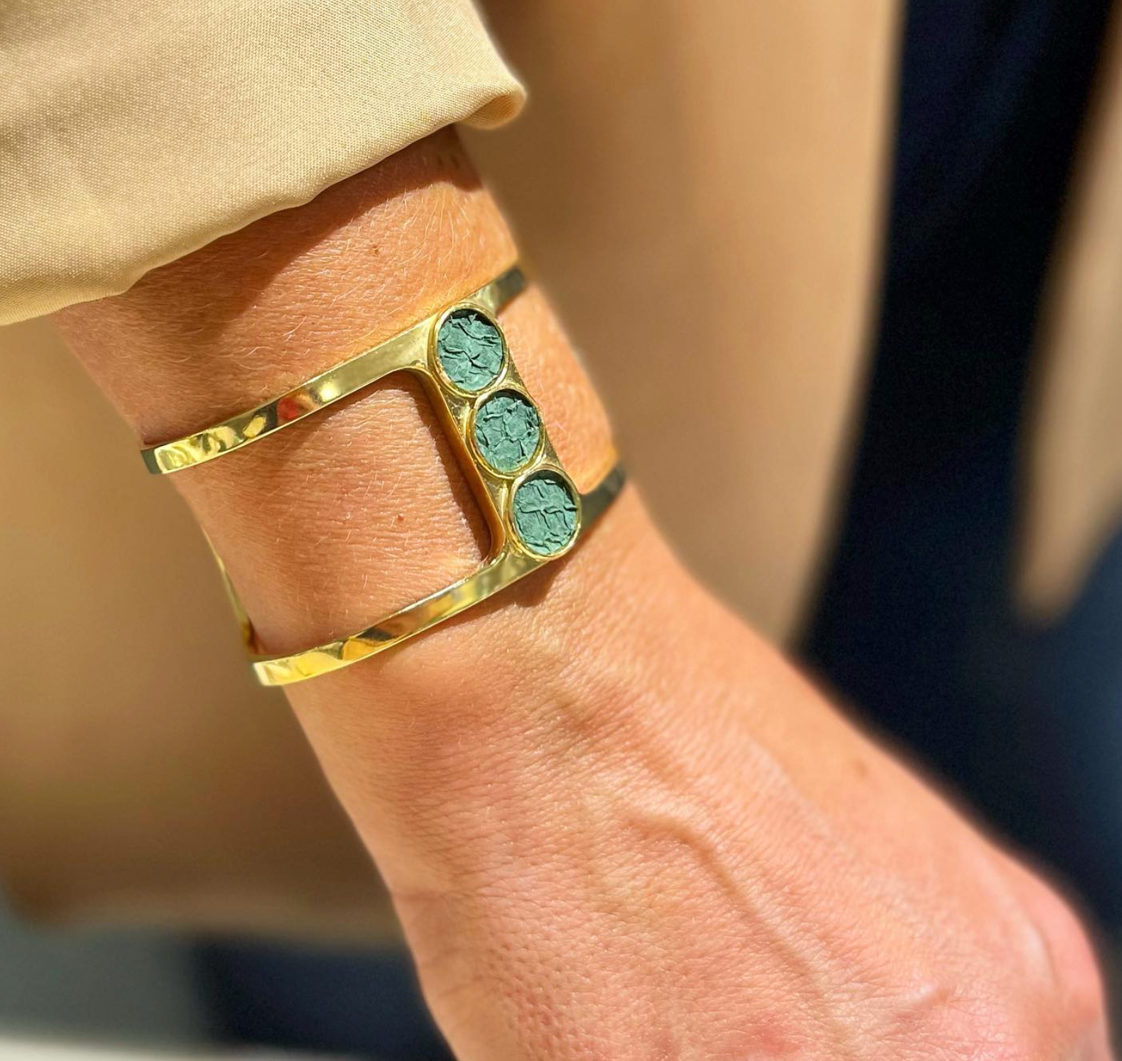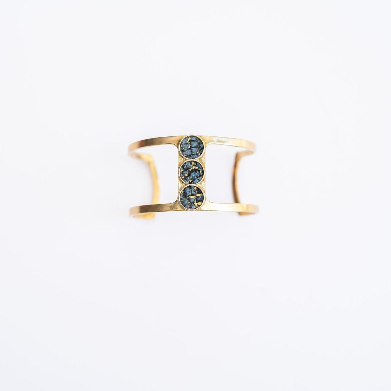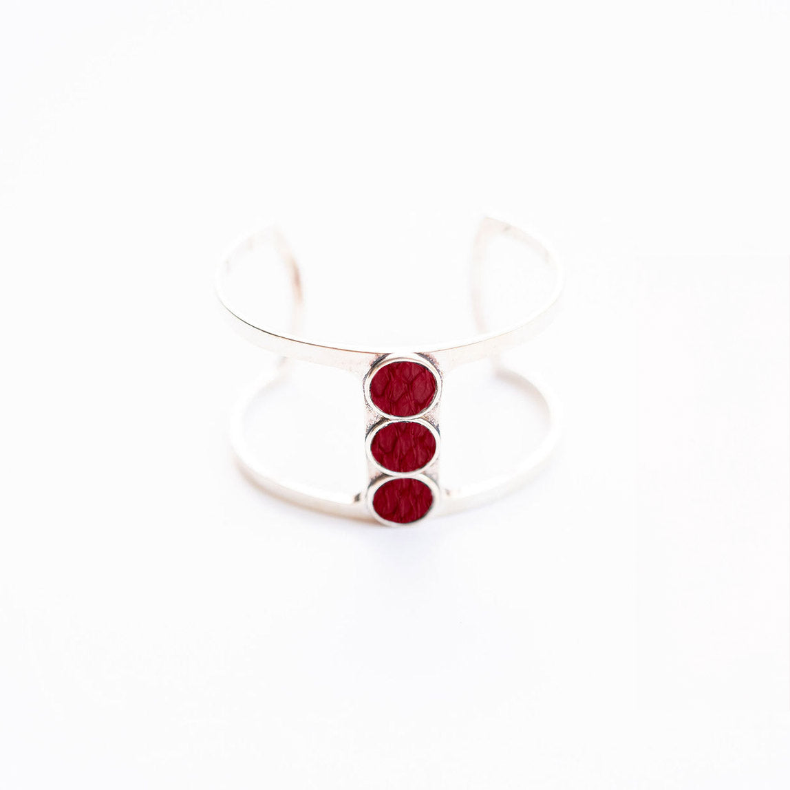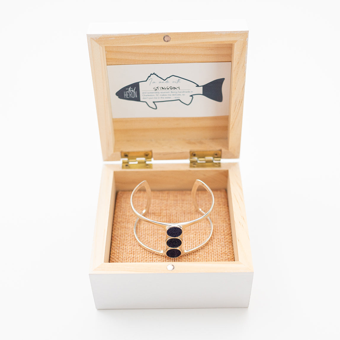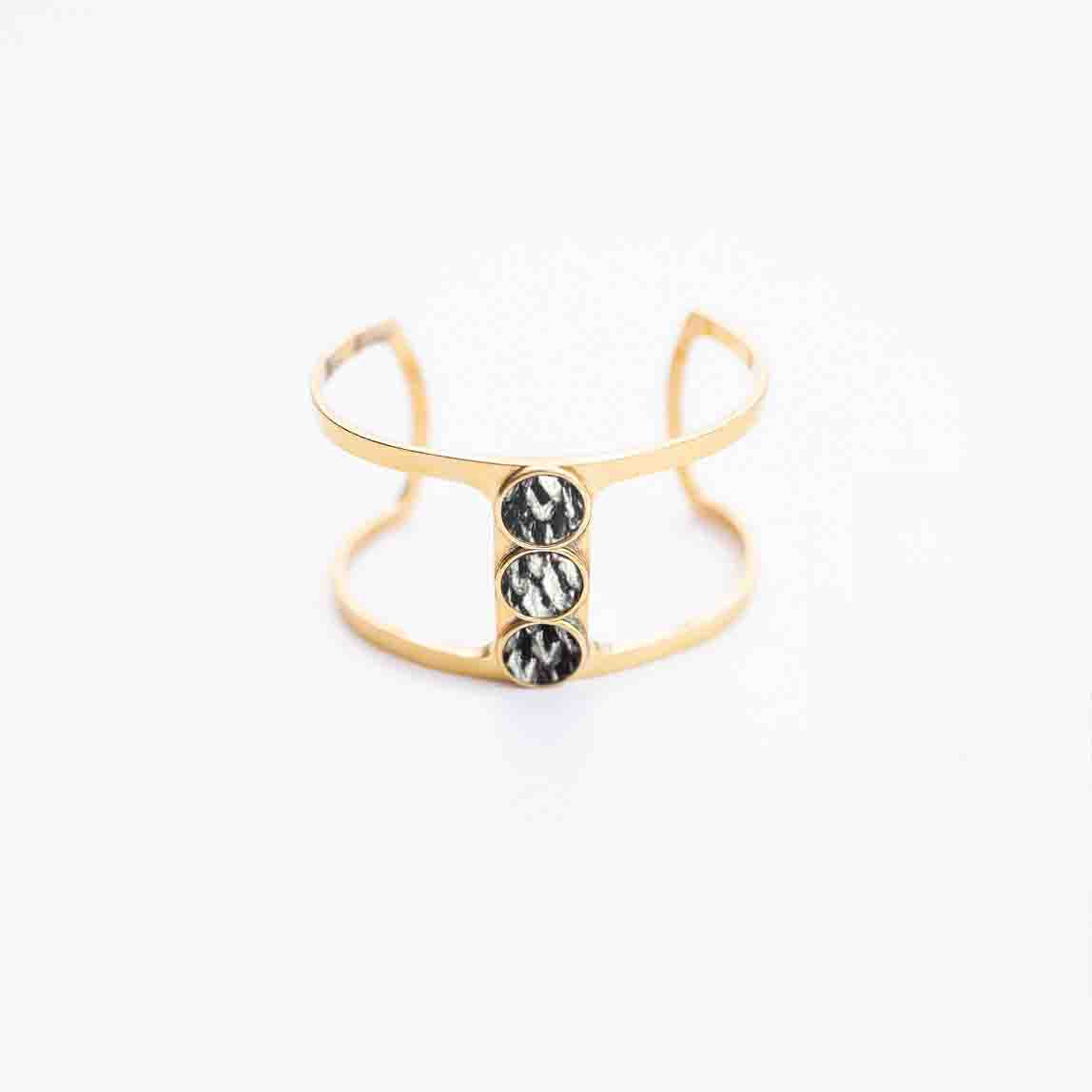 The Toogoodoo Cuff is a uniquely elegant piece featuring three centered bezels adorned with vibrant, colorful fish leather or fish eyes, infusing a hint of personal flair into your outfit.