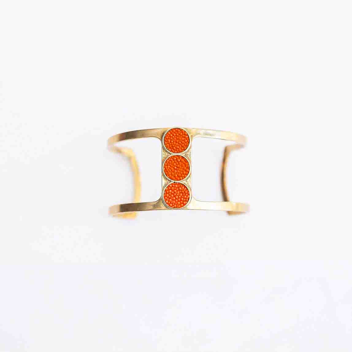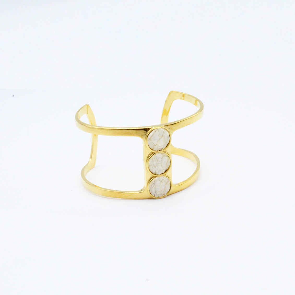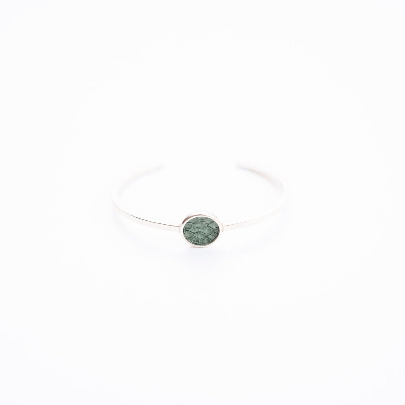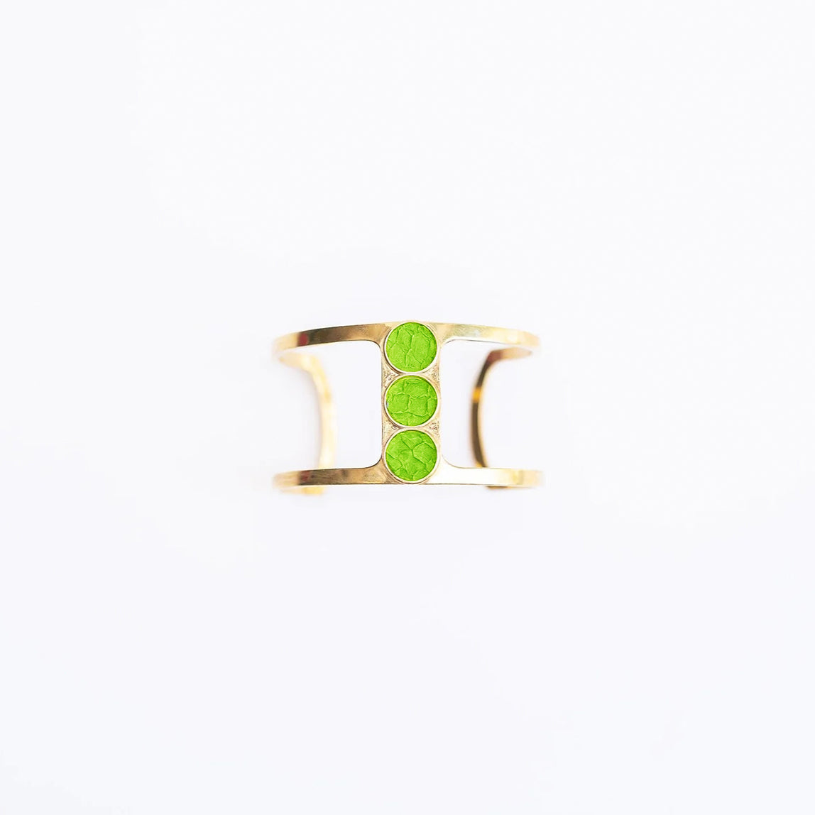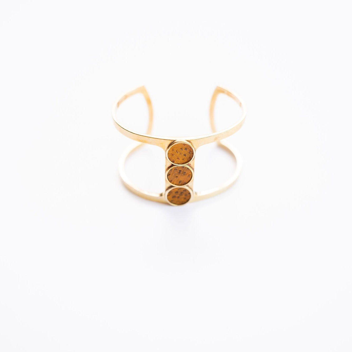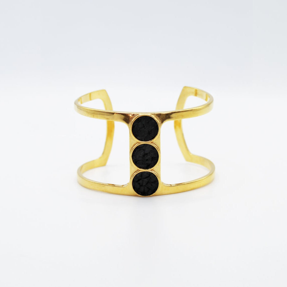 The Toogoodoo Cuff is a uniquely elegant piece featuring three centered bezels adorned with vibrant, colorful fish leather or fish eyes, infusing a hint of personal flair into your outfit.
