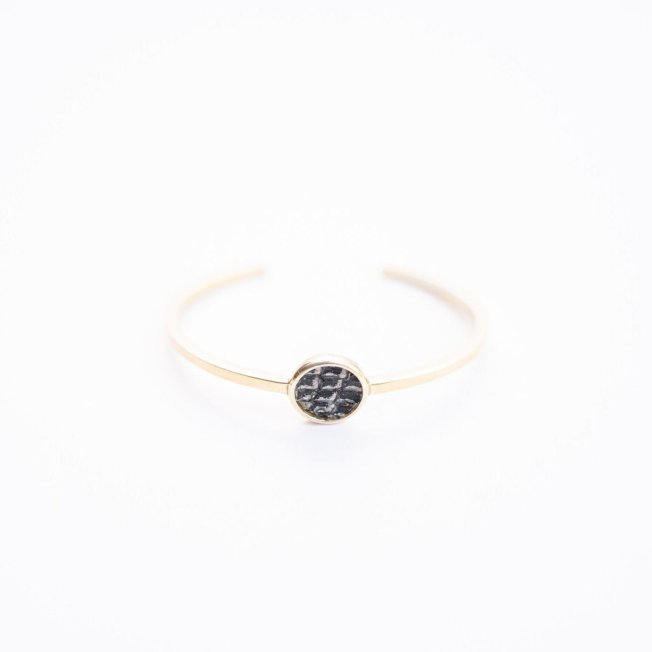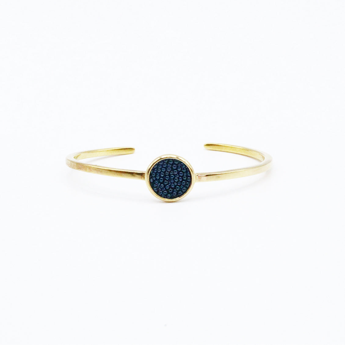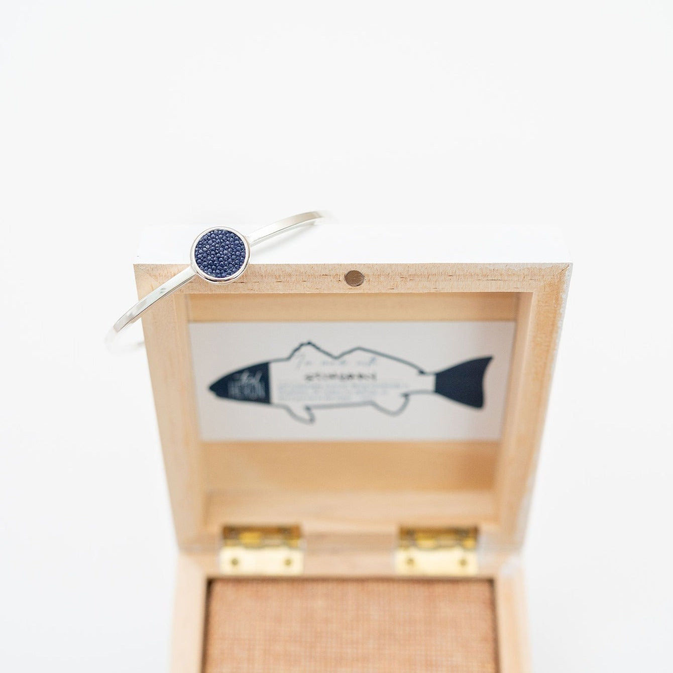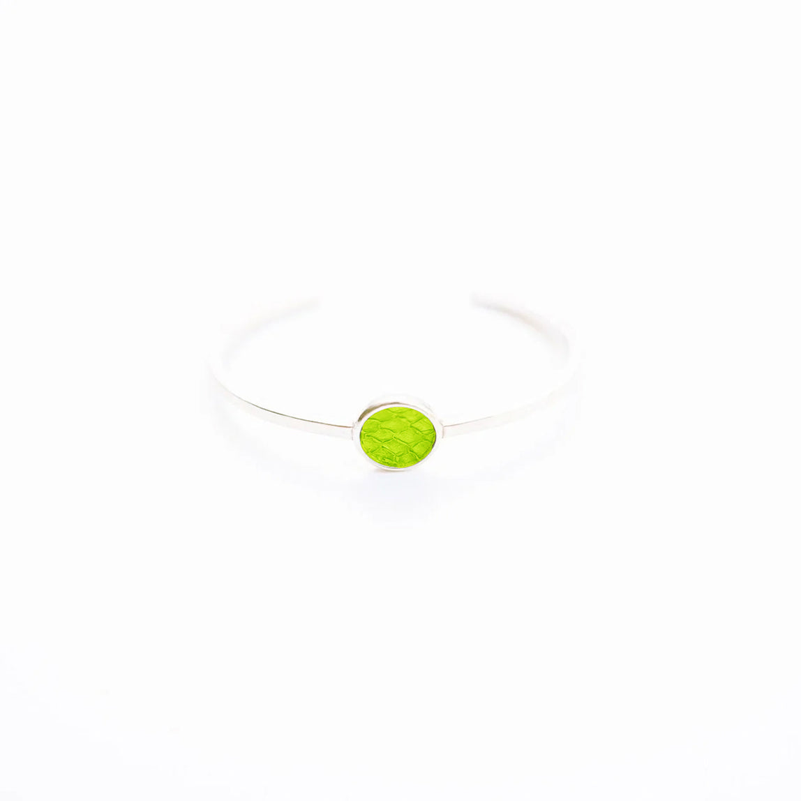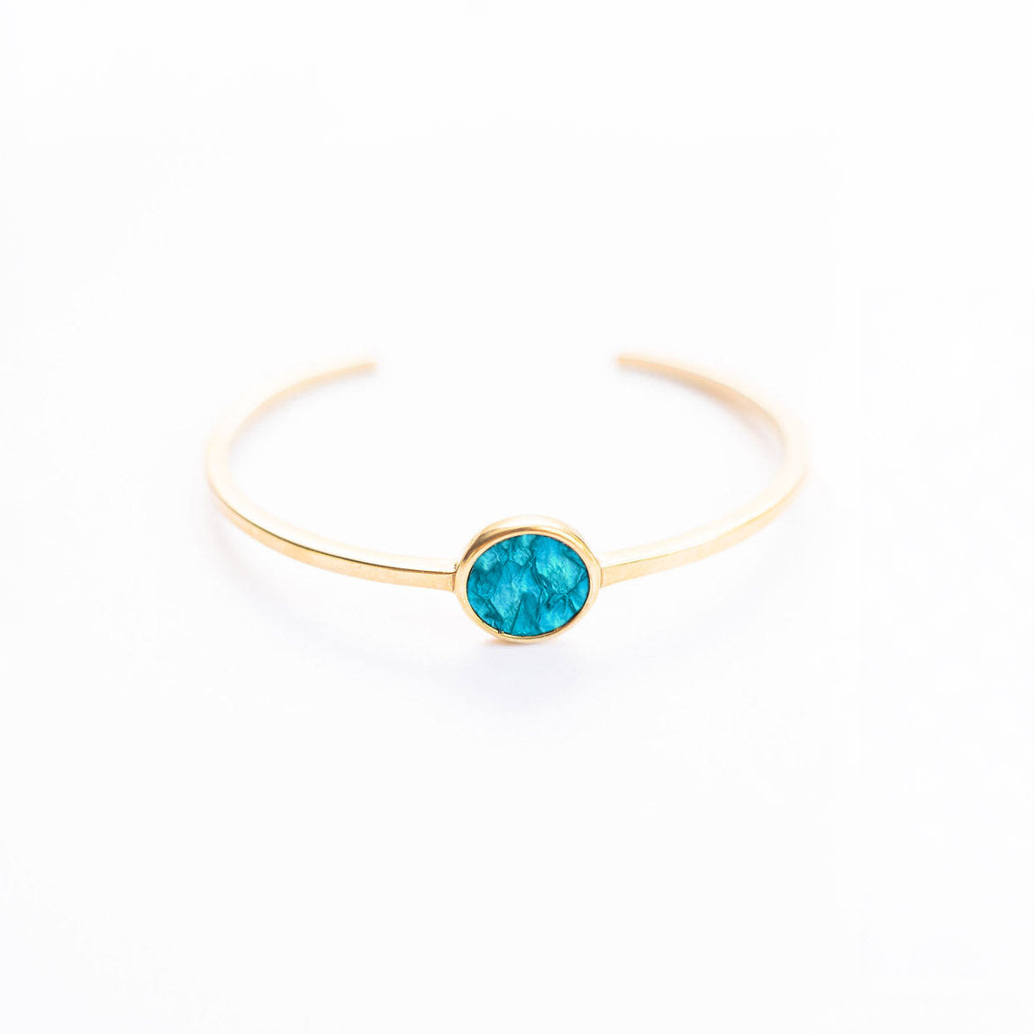 The Toogoodoo Cuff is a uniquely elegant piece featuring three centered bezels adorned with vibrant, colorful fish leather or fish eyes, infusing a hint of personal flair into your outfit.