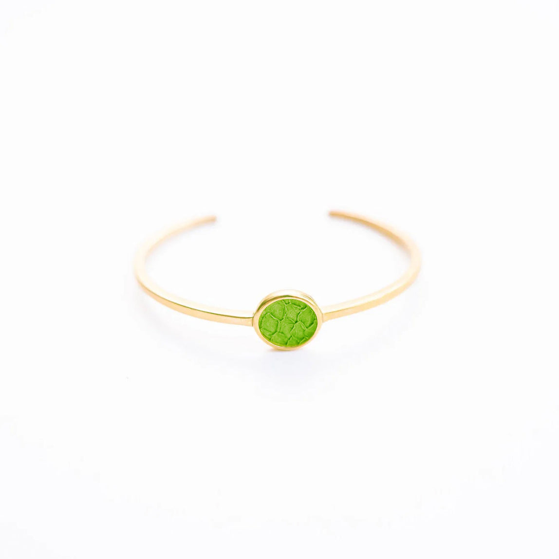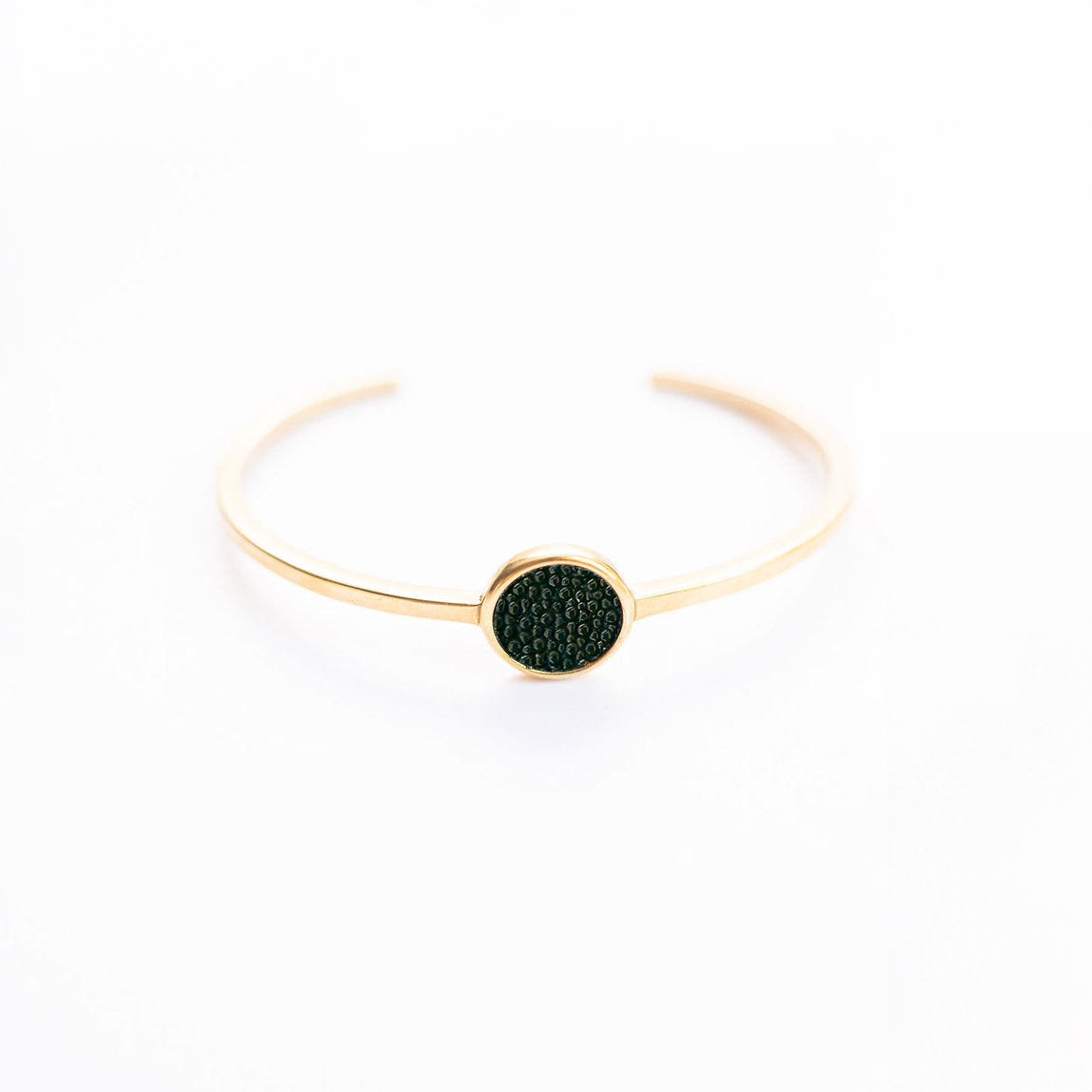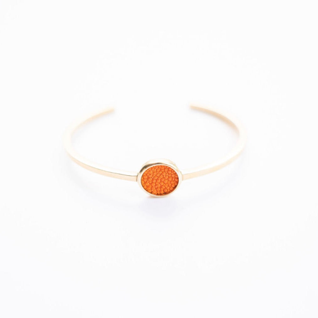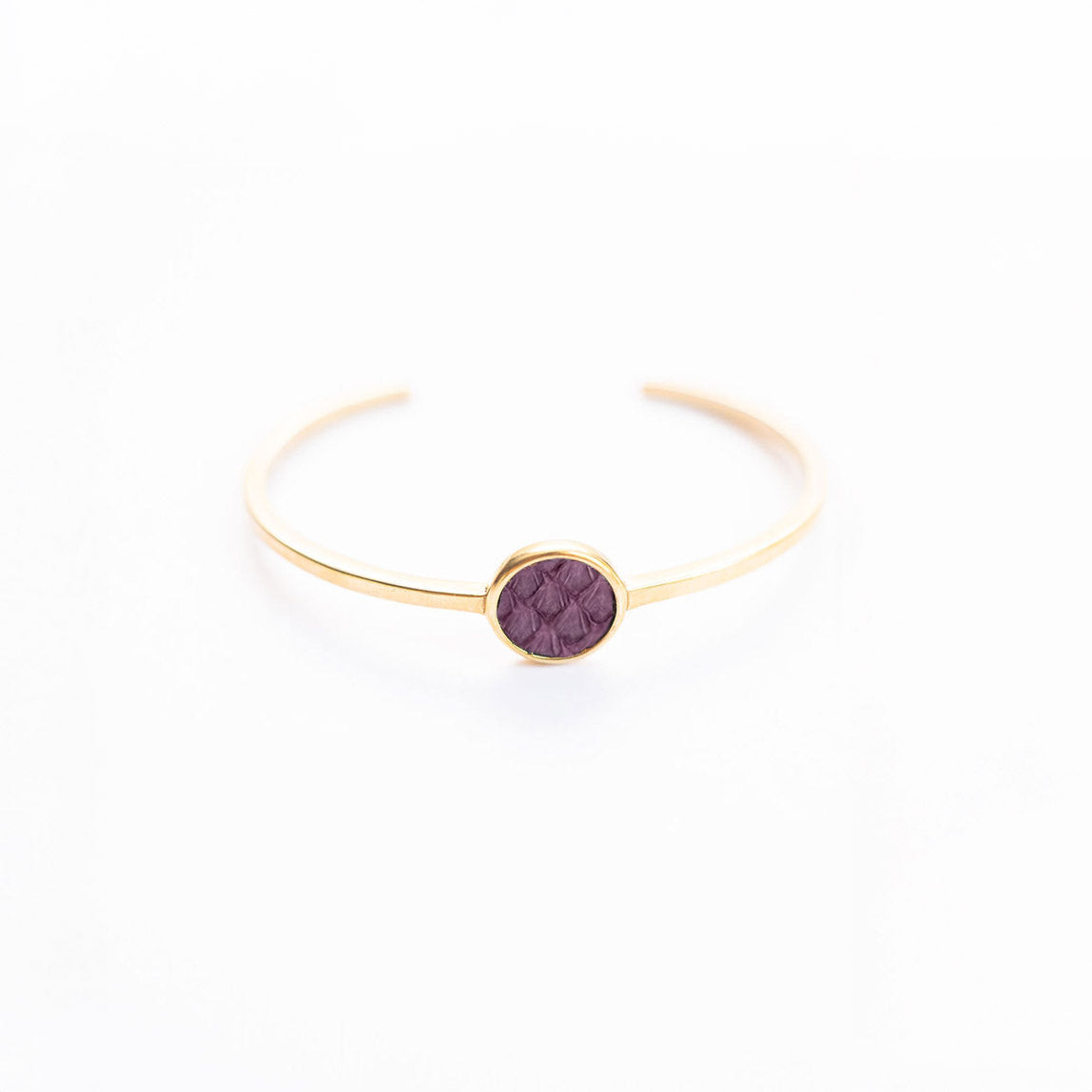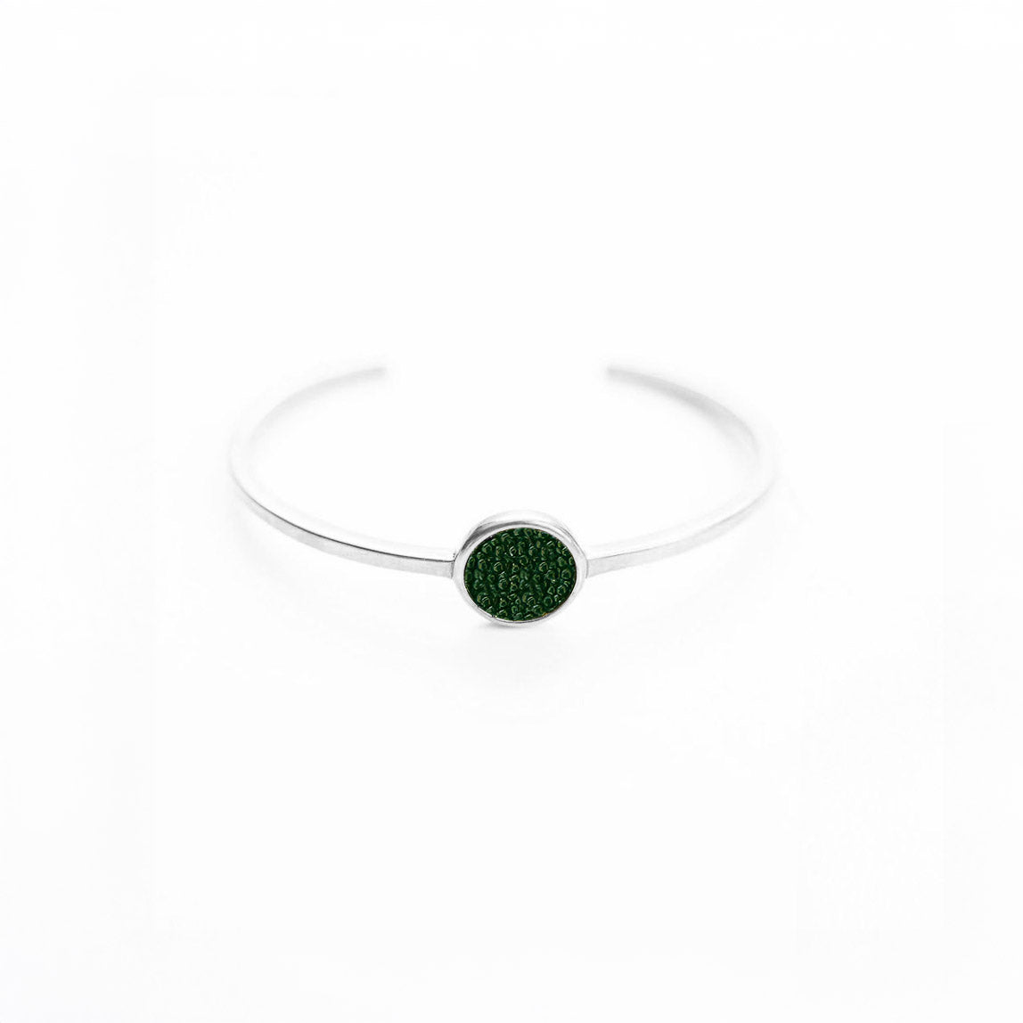 The Toogoodoo Cuff is a uniquely elegant piece featuring three centered bezels adorned with vibrant, colorful fish leather or fish eyes, infusing a hint of personal flair into your outfit.