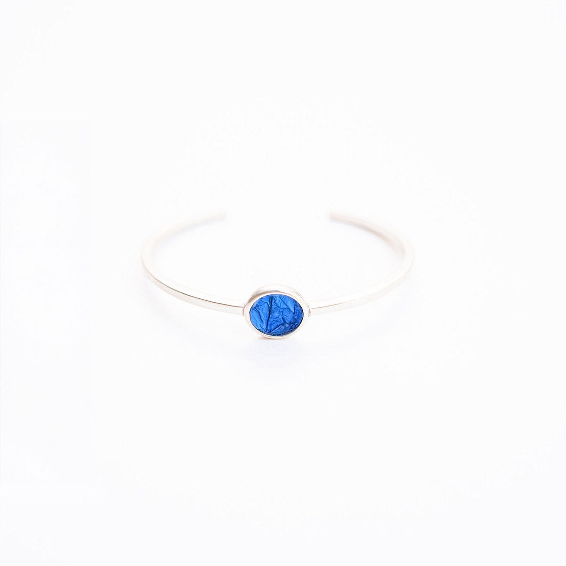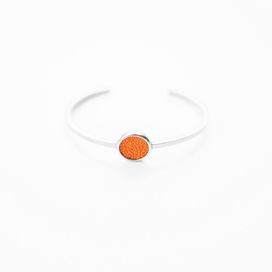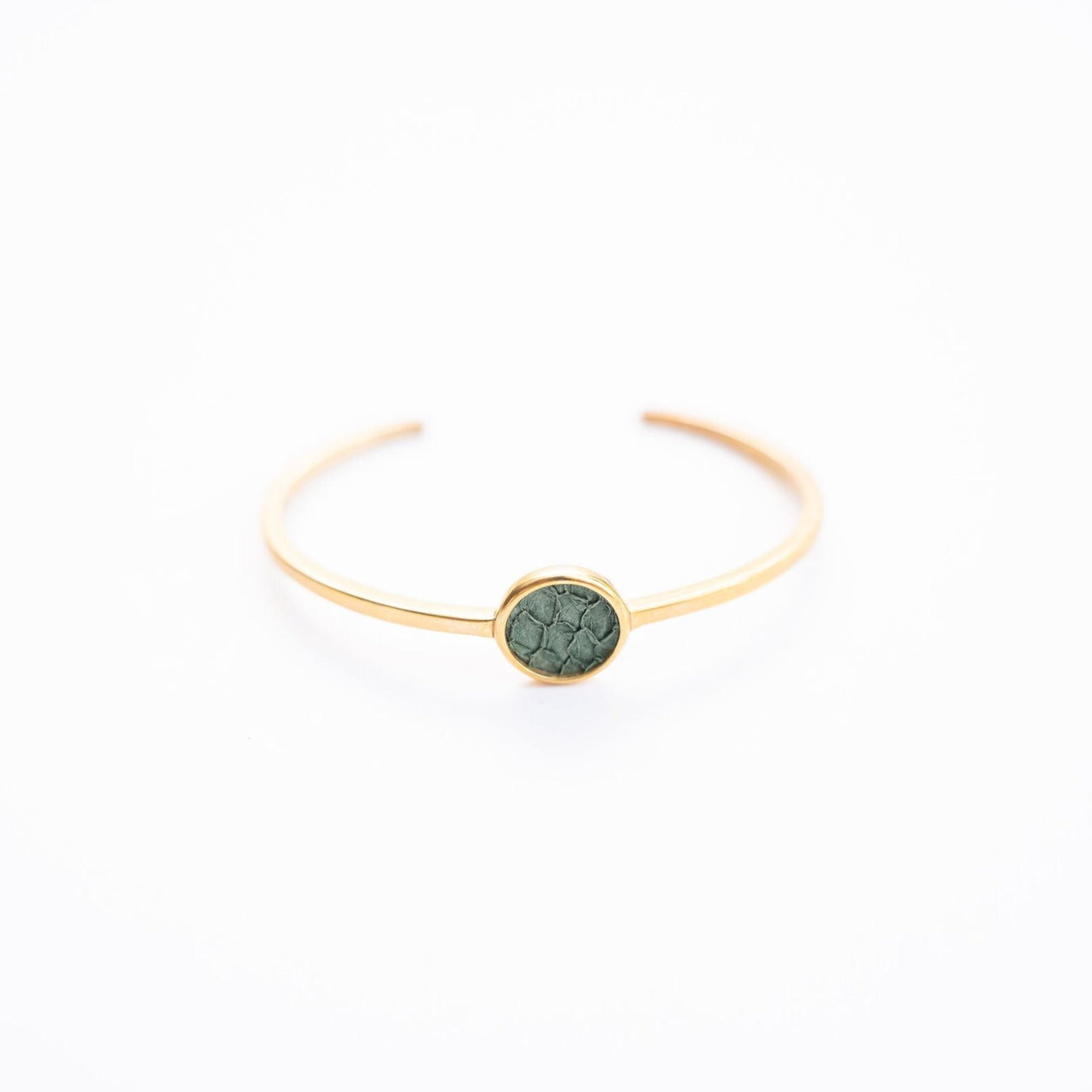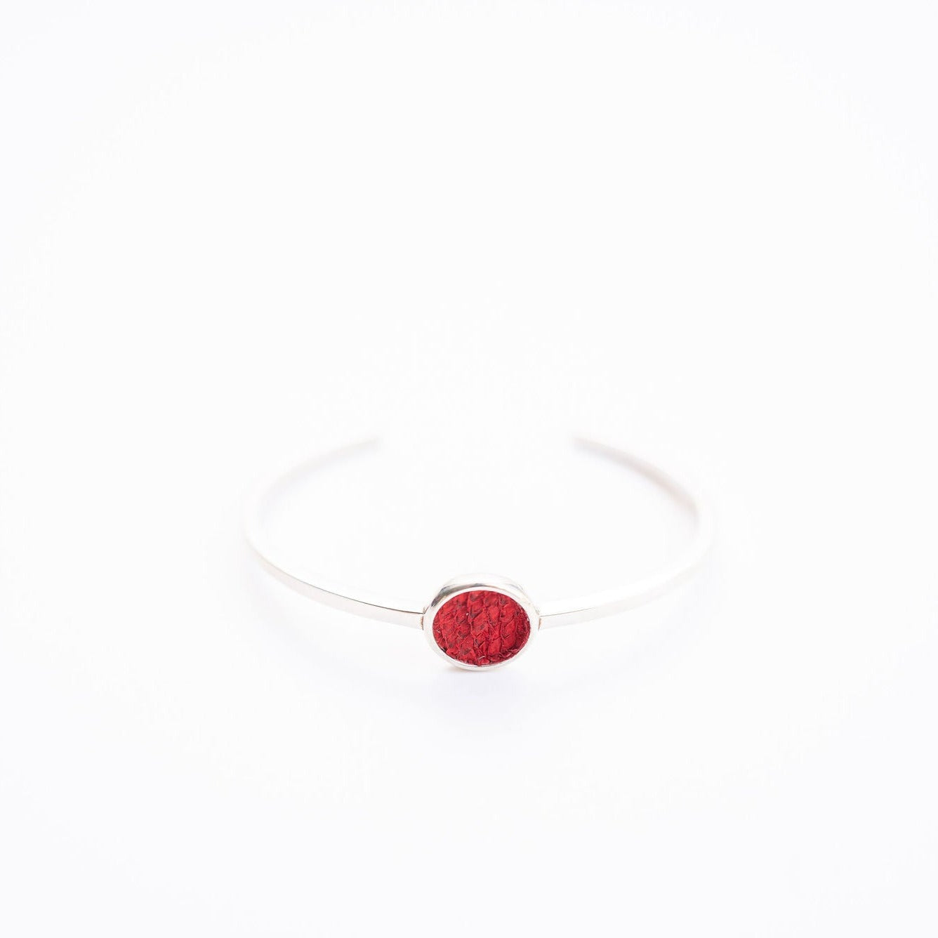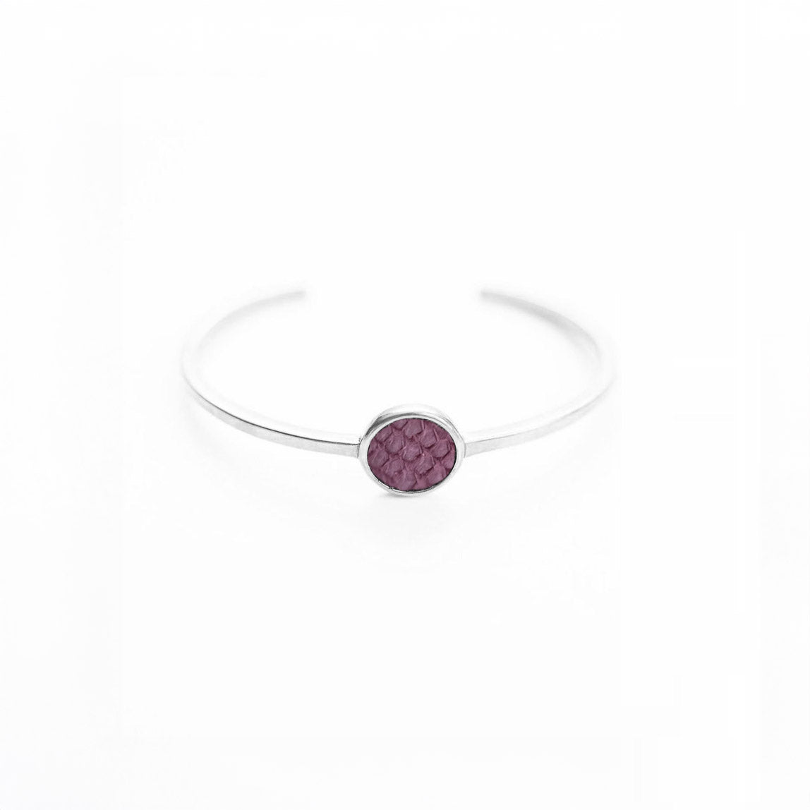 The Toogoodoo Cuff is a uniquely elegant piece featuring three centered bezels adorned with vibrant, colorful fish leather or fish eyes, infusing a hint of personal flair into your outfit.