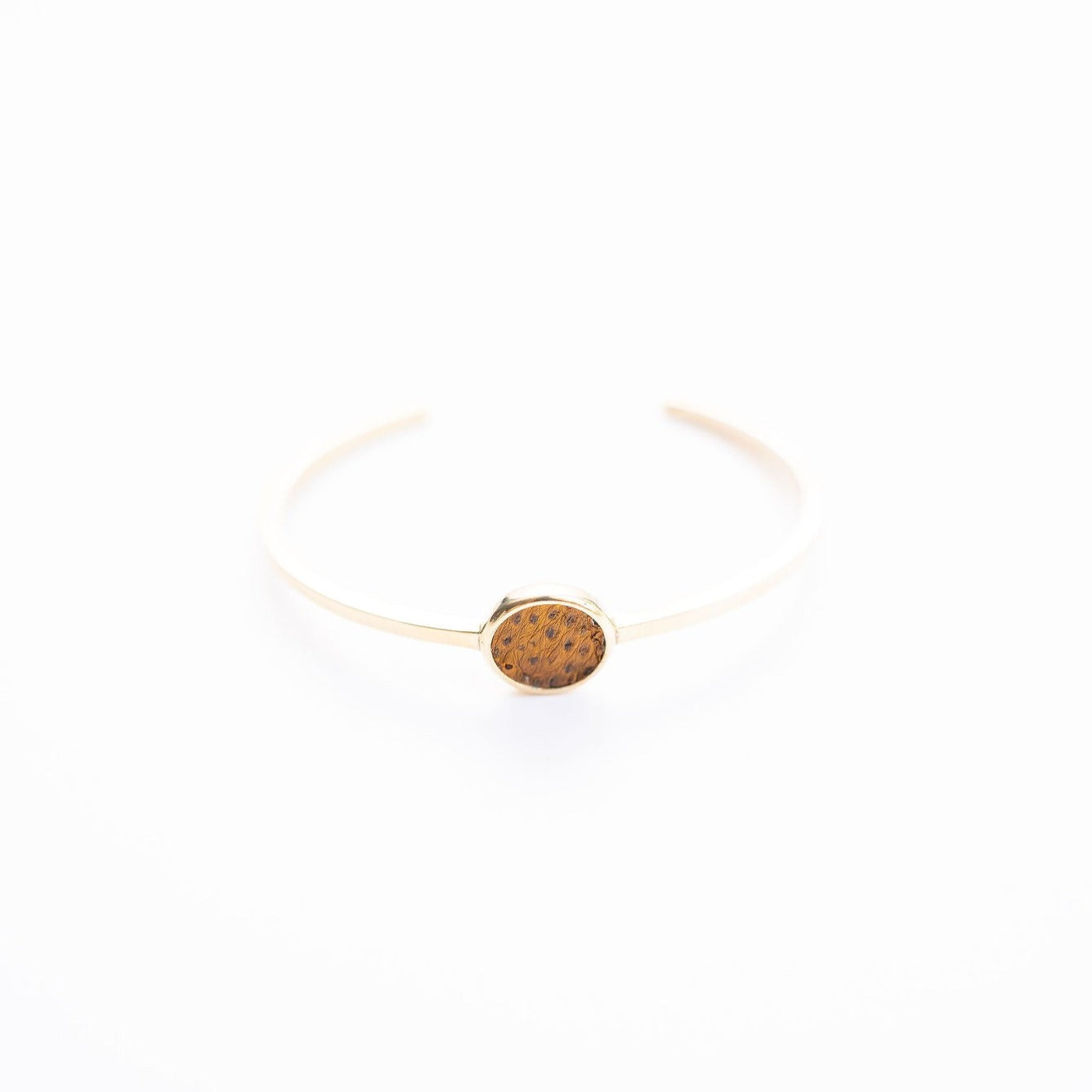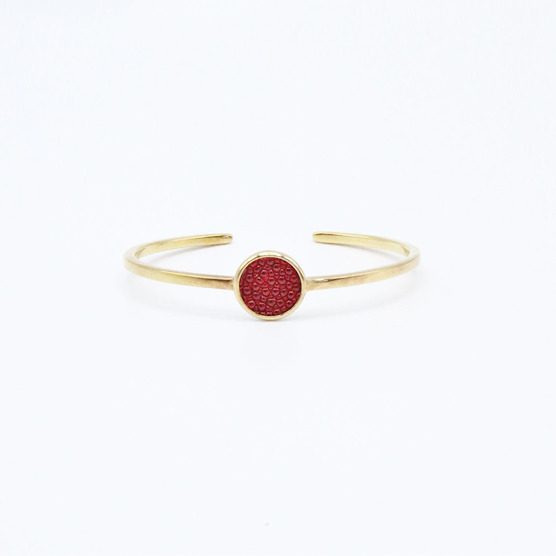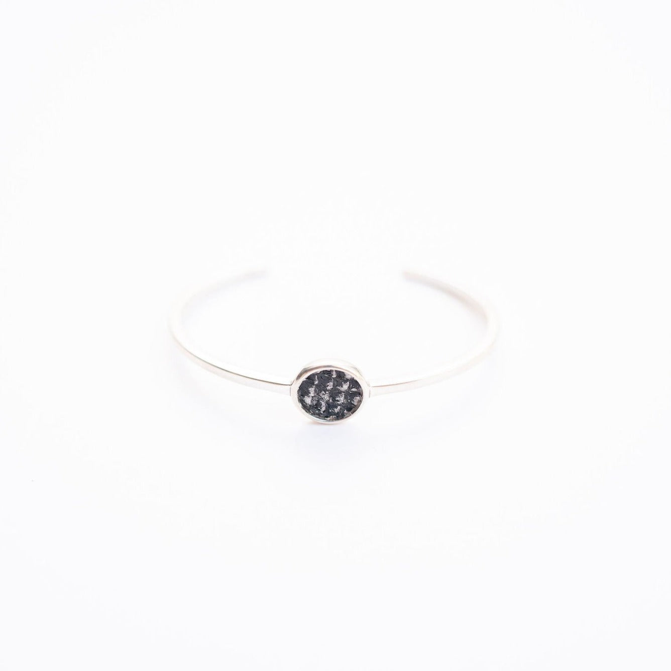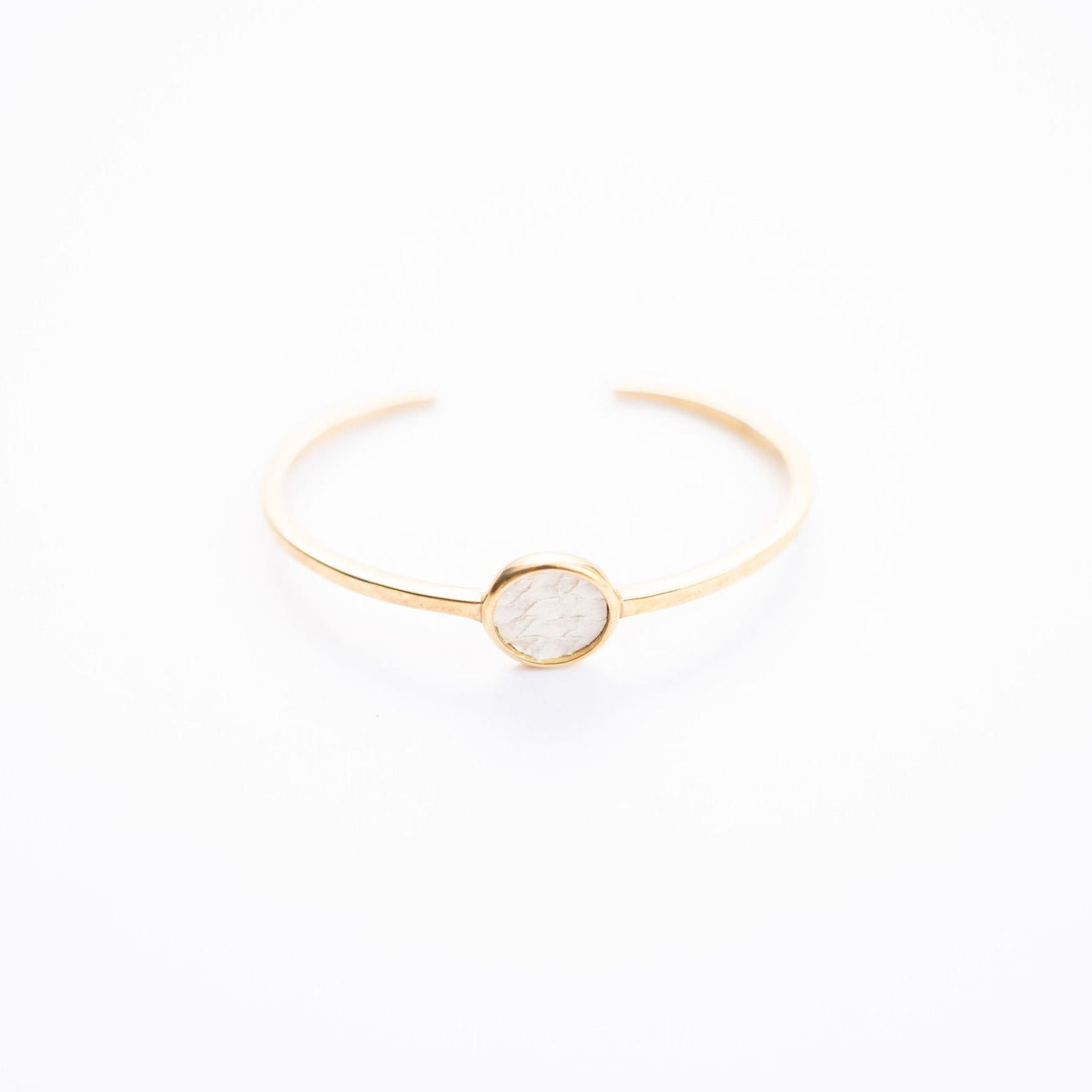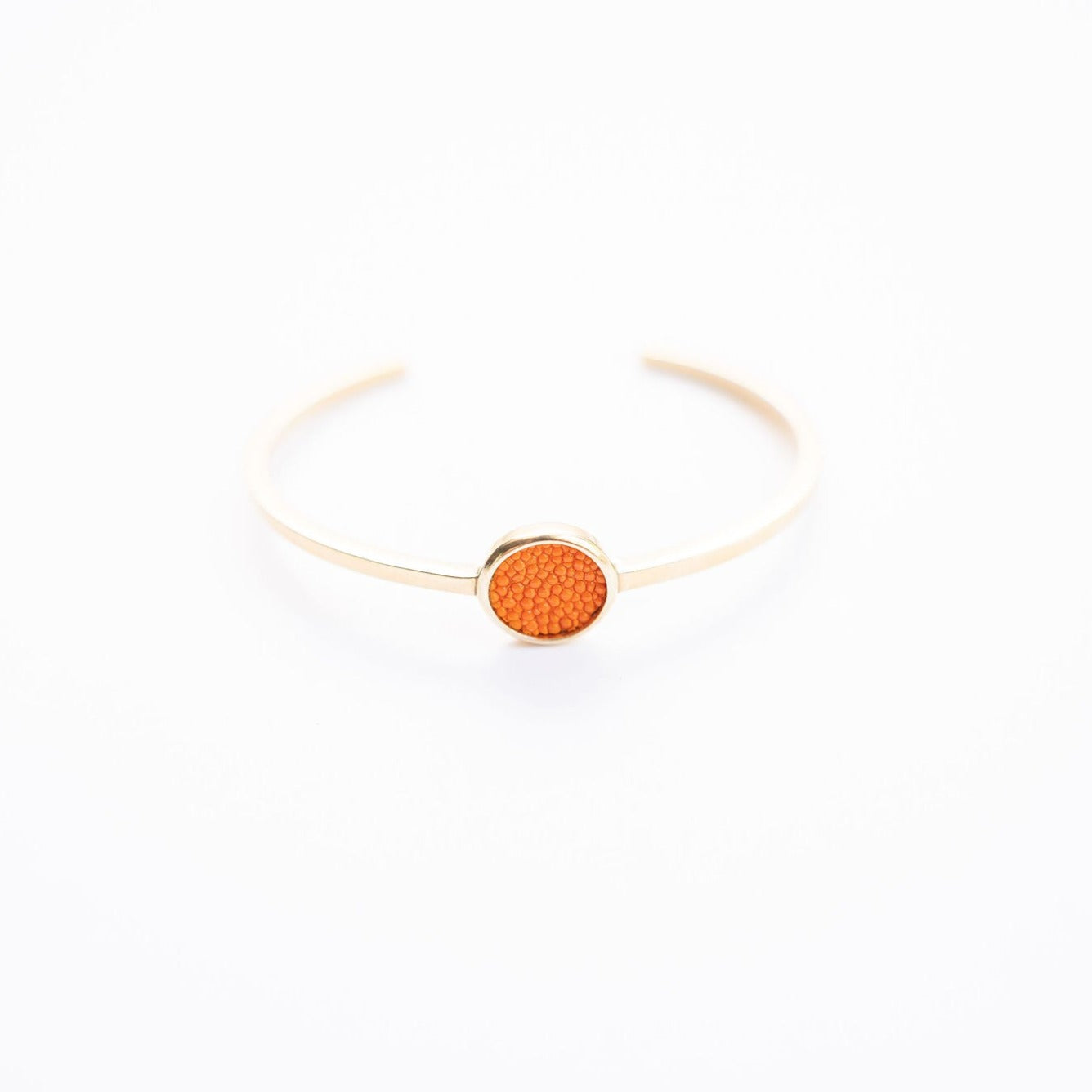 The Toogoodoo Cuff is a uniquely elegant piece featuring three centered bezels adorned with vibrant, colorful fish leather or fish eyes, infusing a hint of personal flair into your outfit.
