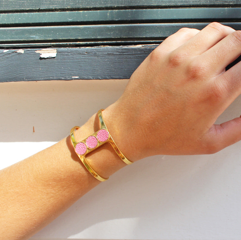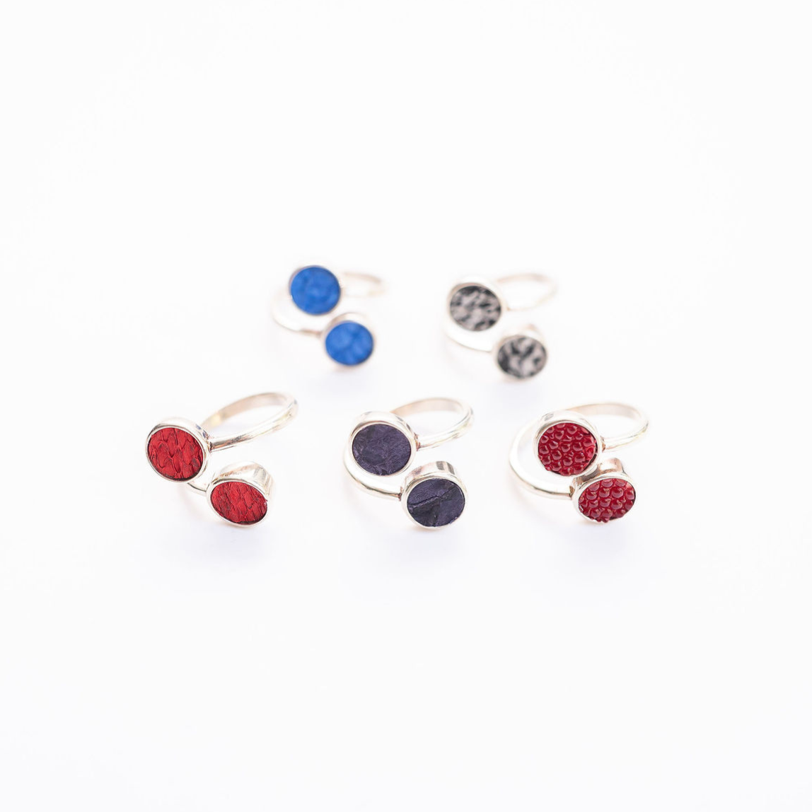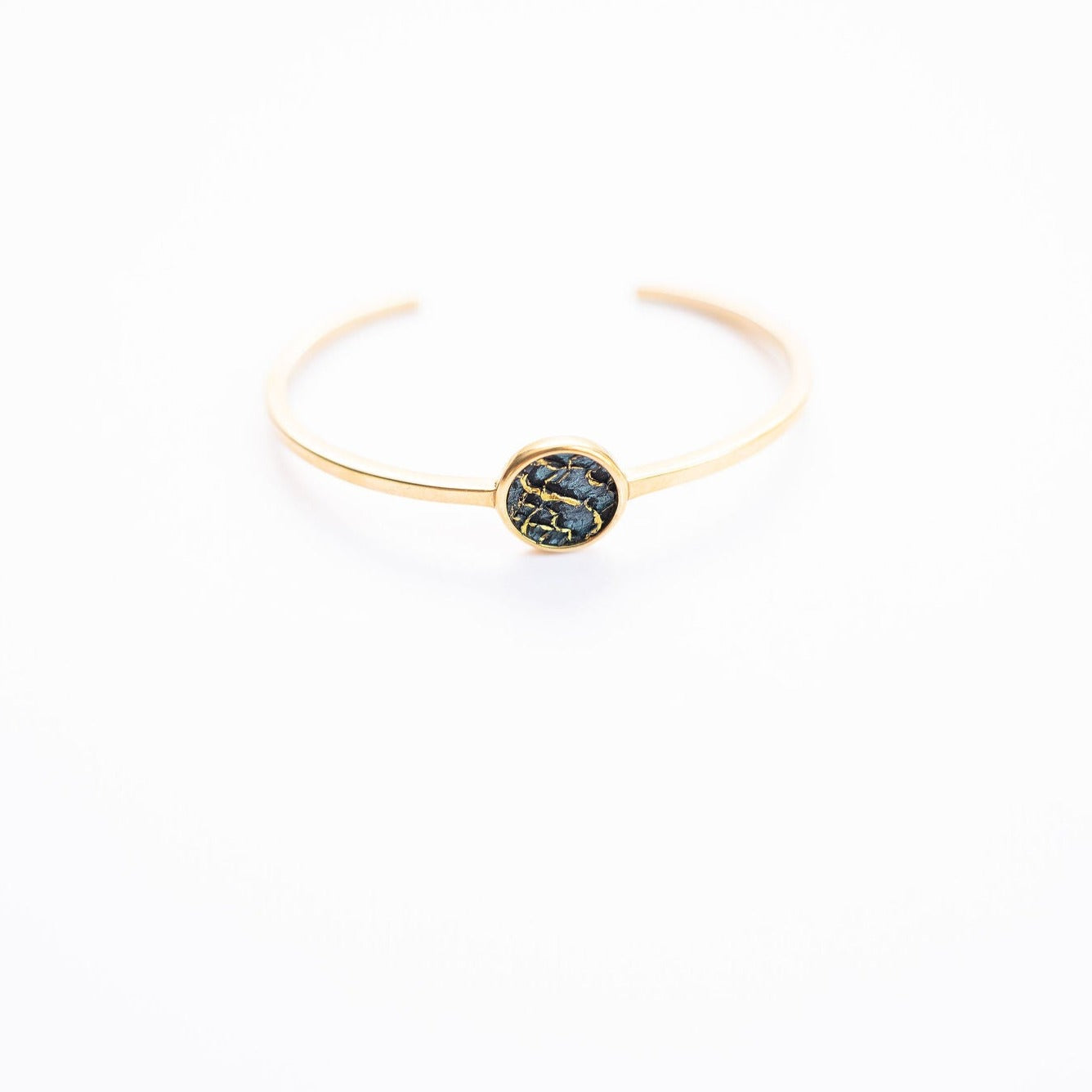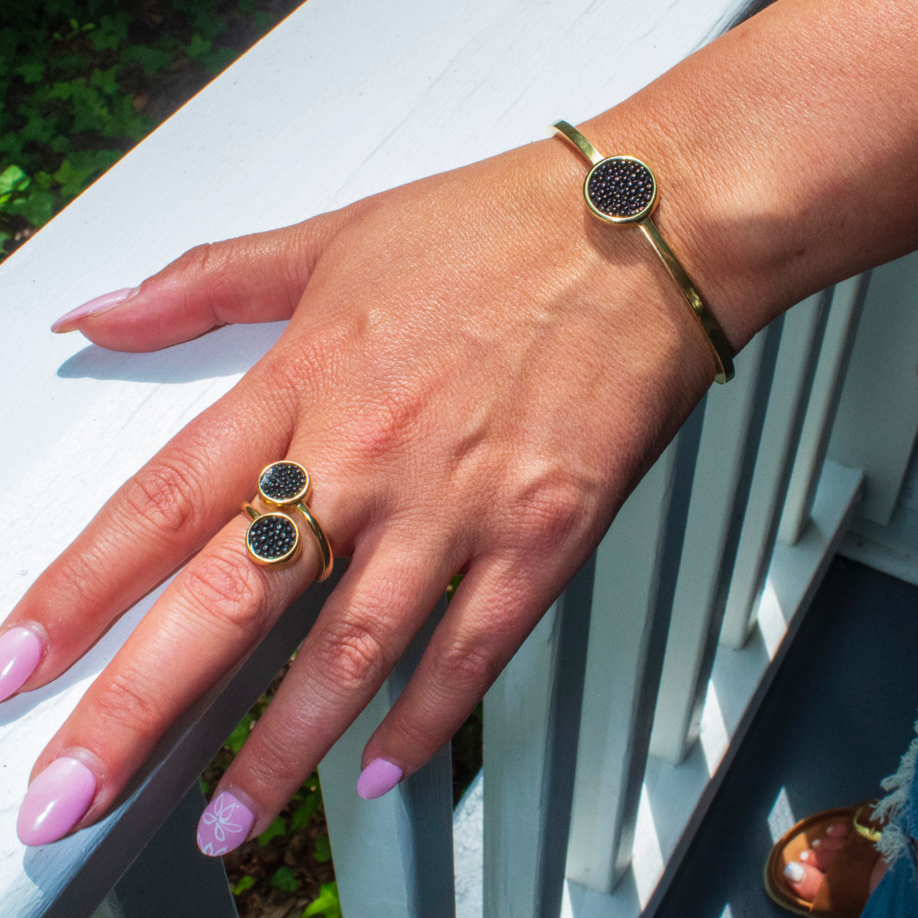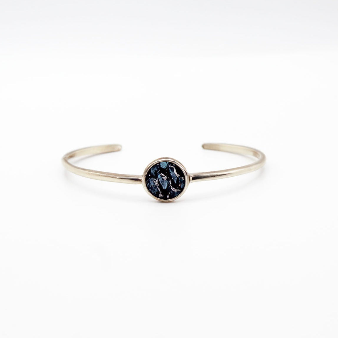 The Toogoodoo Cuff is a uniquely elegant piece featuring three centered bezels adorned with vibrant, colorful fish leather or fish eyes, infusing a hint of personal flair into your outfit.