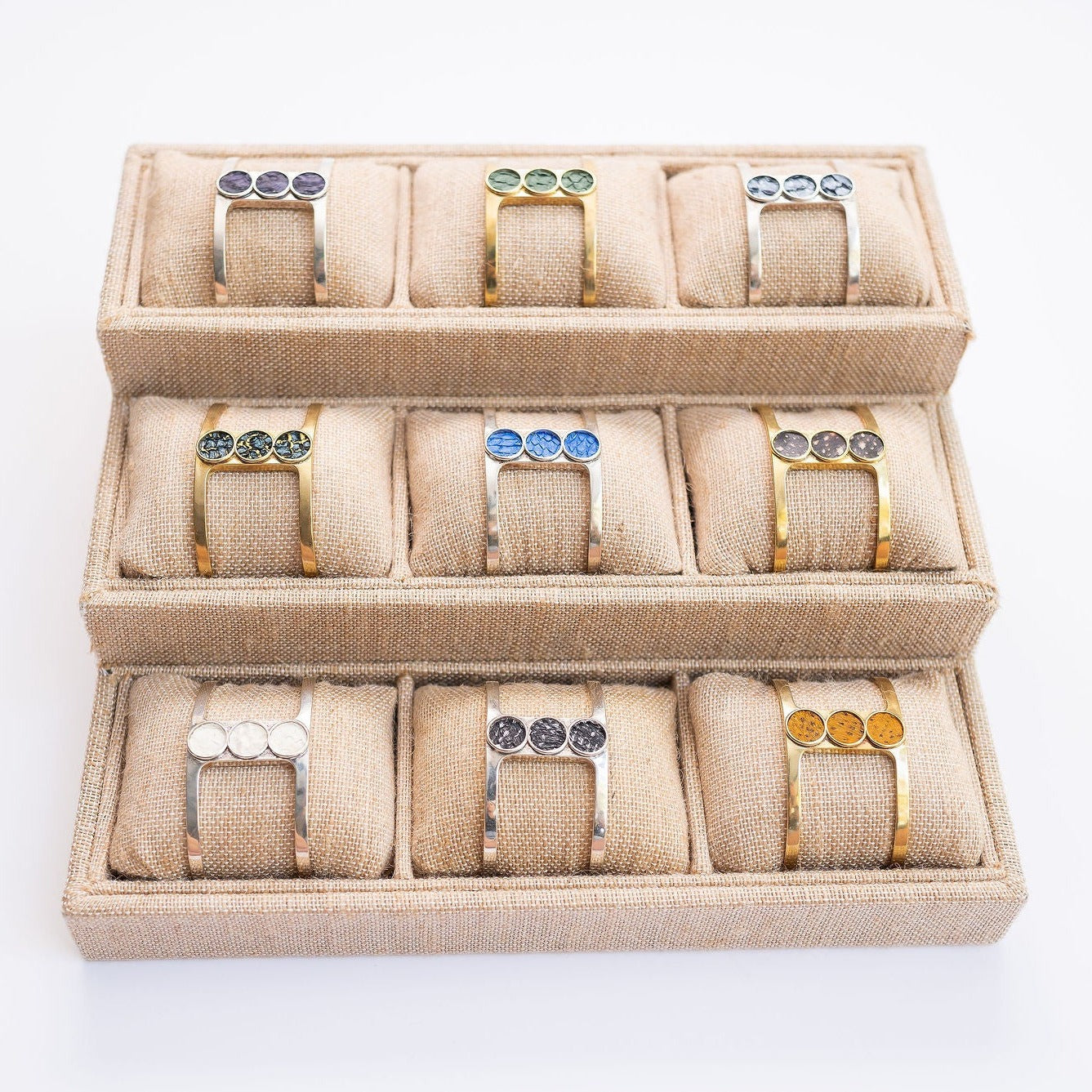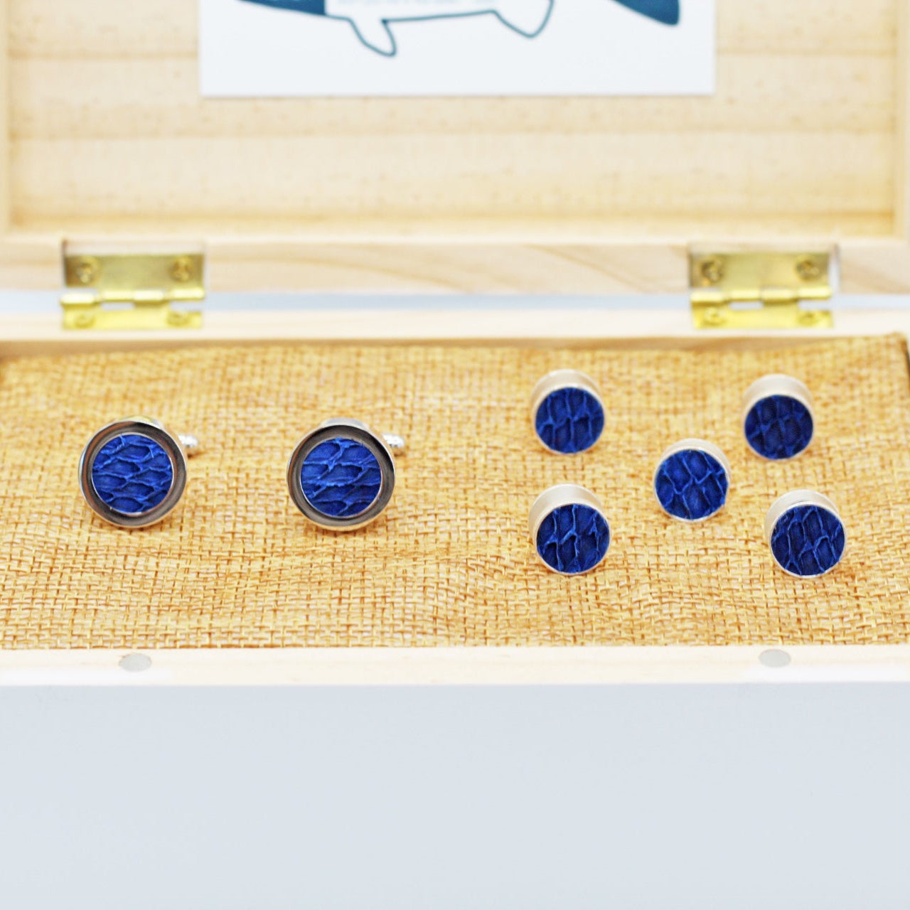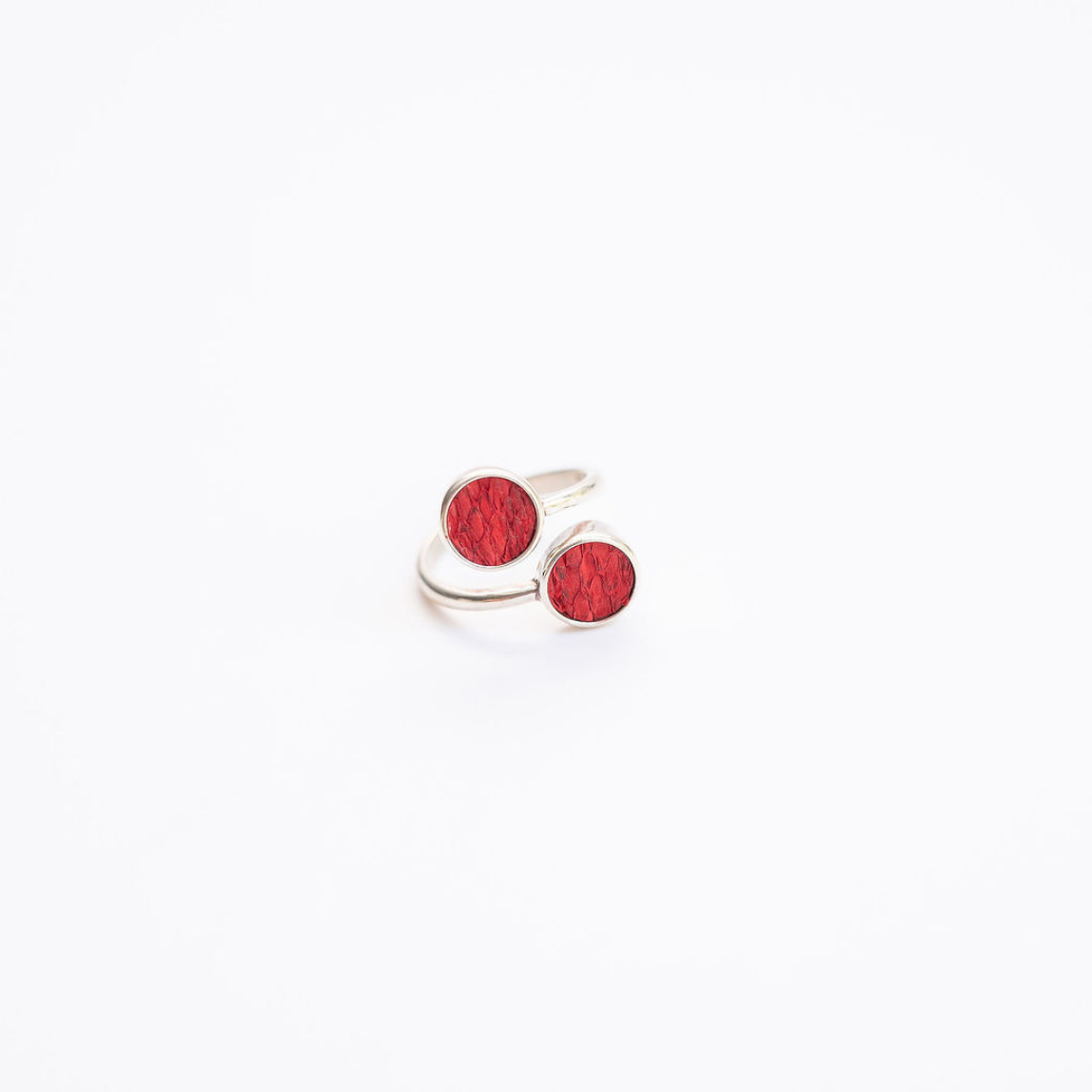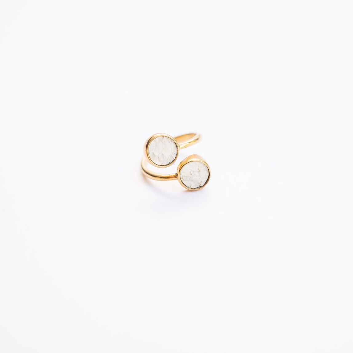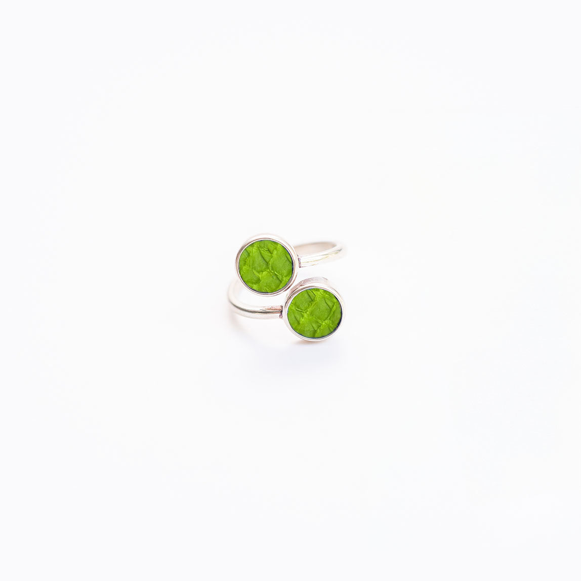 The Toogoodoo Cuff is a uniquely elegant piece featuring three centered bezels adorned with vibrant, colorful fish leather or fish eyes, infusing a hint of personal flair into your outfit.