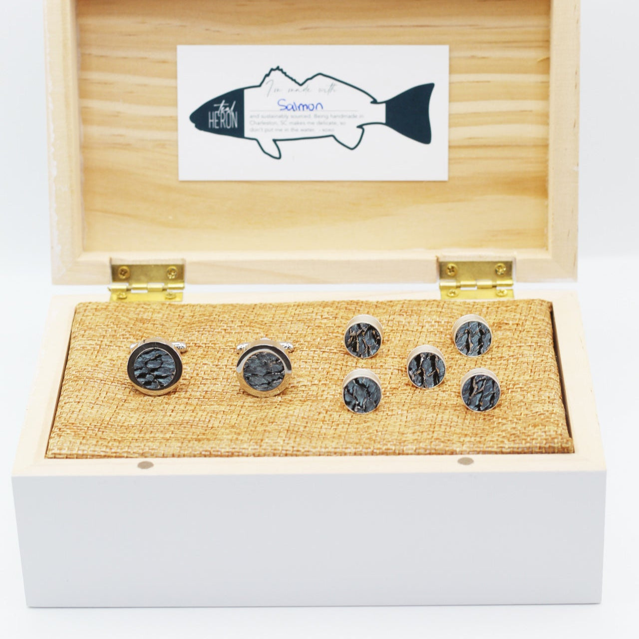 The Ashepoo Cuff stands out with a bold presence, expertly showcasing intricate fish leather patterns that add a touch of artistic flair and distinctive style to your wrist.