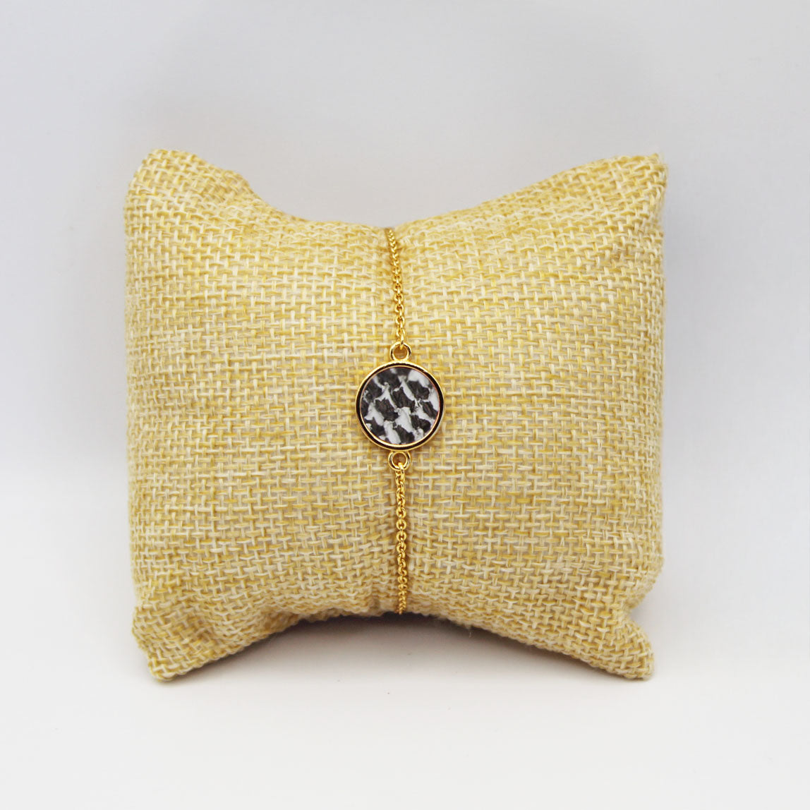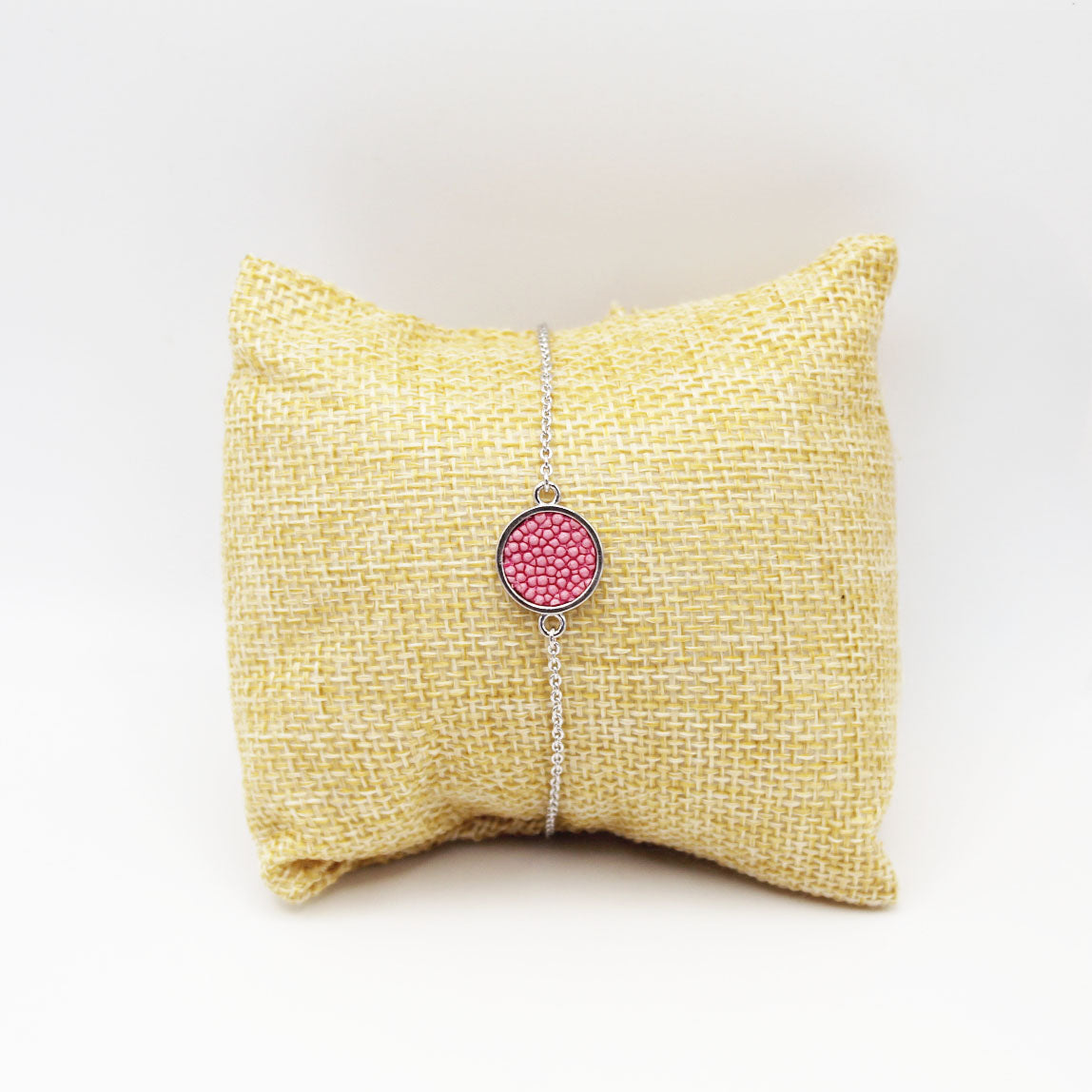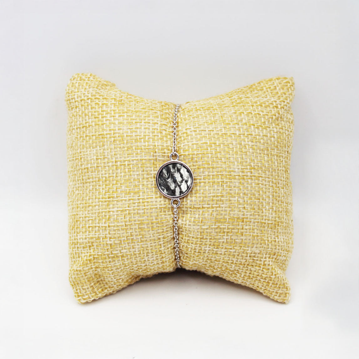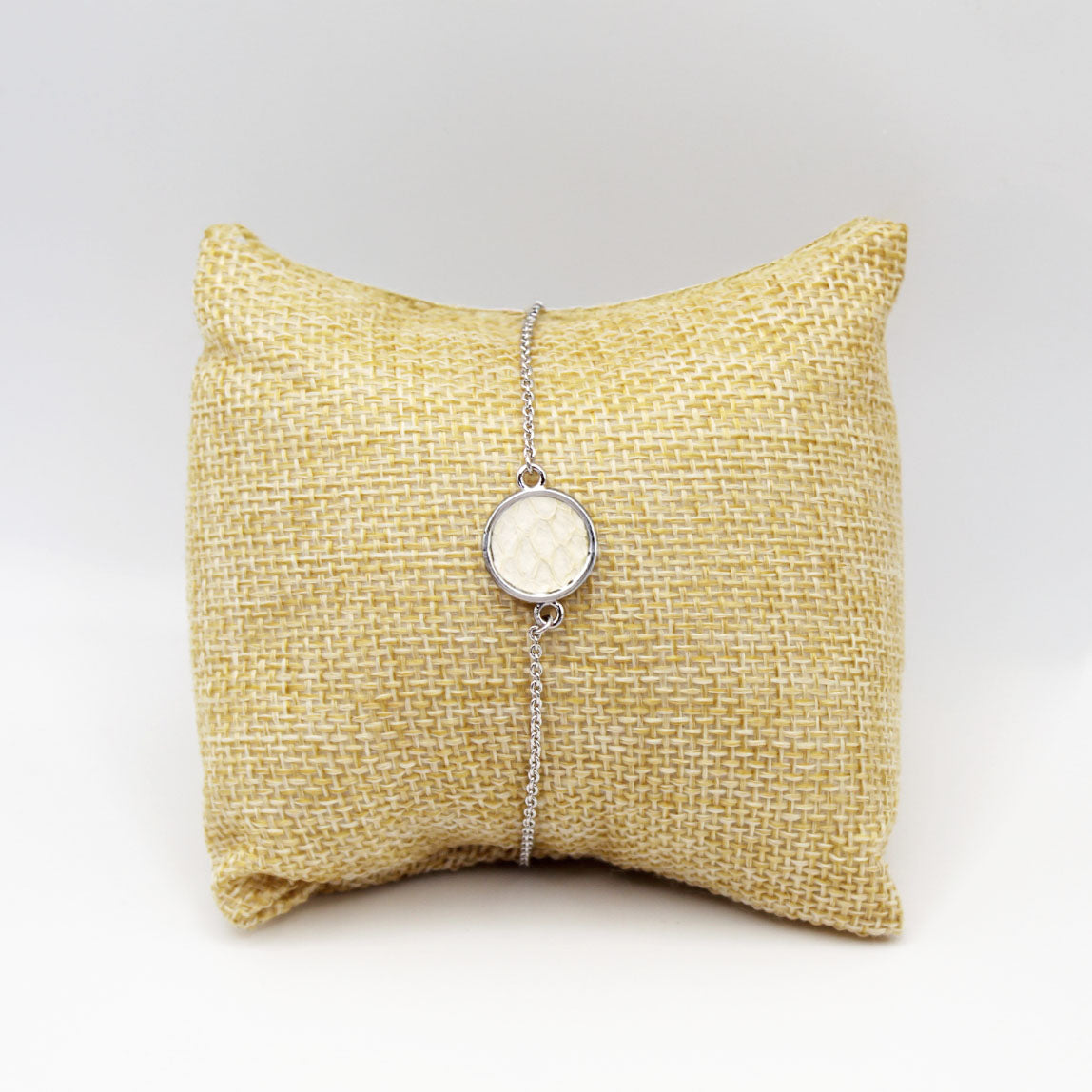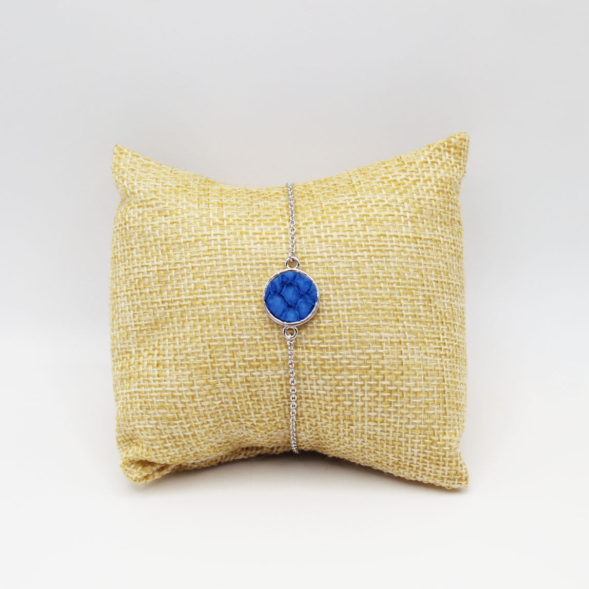 Experience the exquisite elegance of the Cooper Bracelet. Crafted with a sterling silver or 18k gold filled chain and adorned with a round leather mark filled with luxurious stingray or fish skin. This adjustable 6-8 inch bracelet is the perfect accessory for any occasion. Elevate your style with the Cooper Bracelet today.