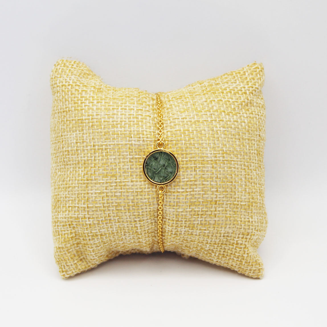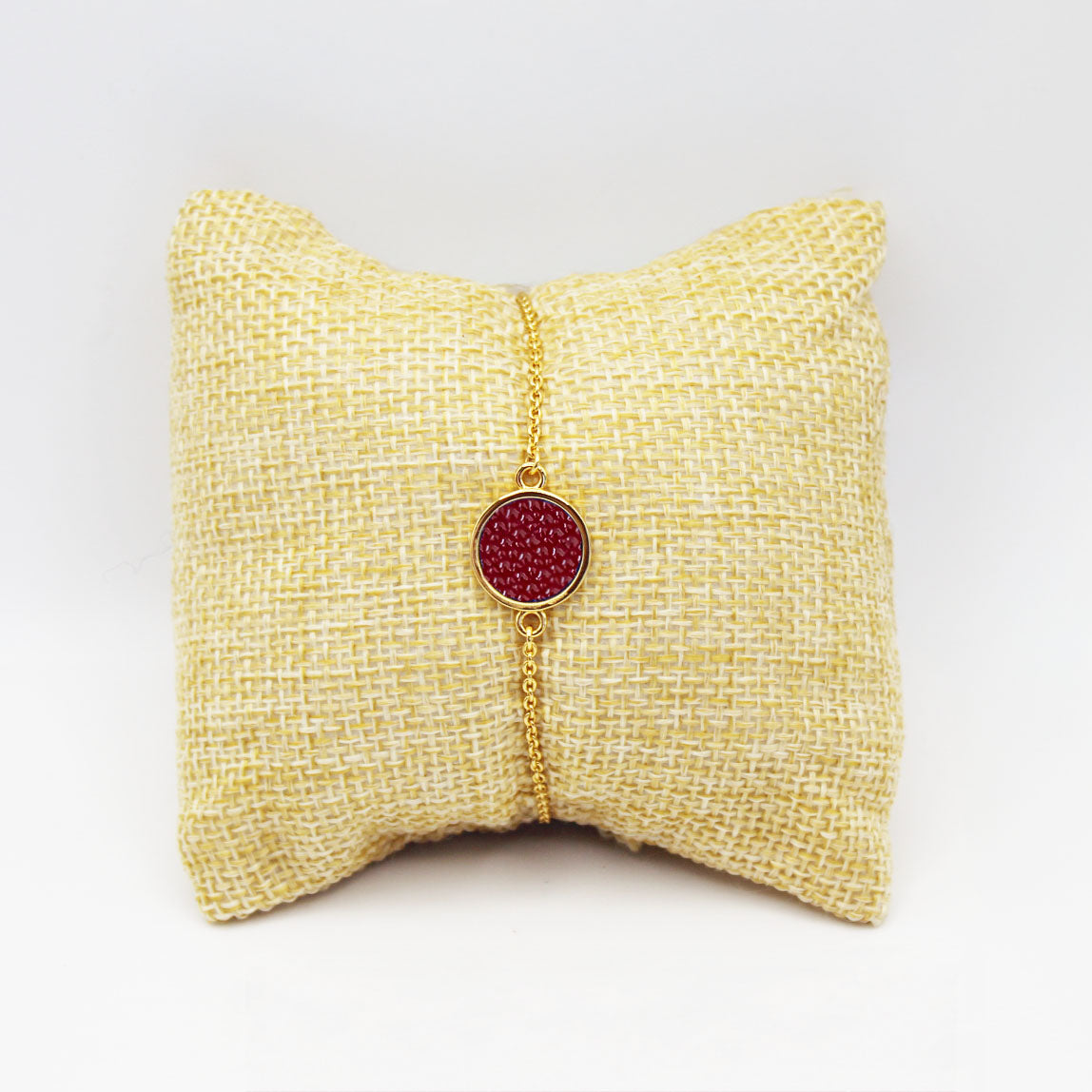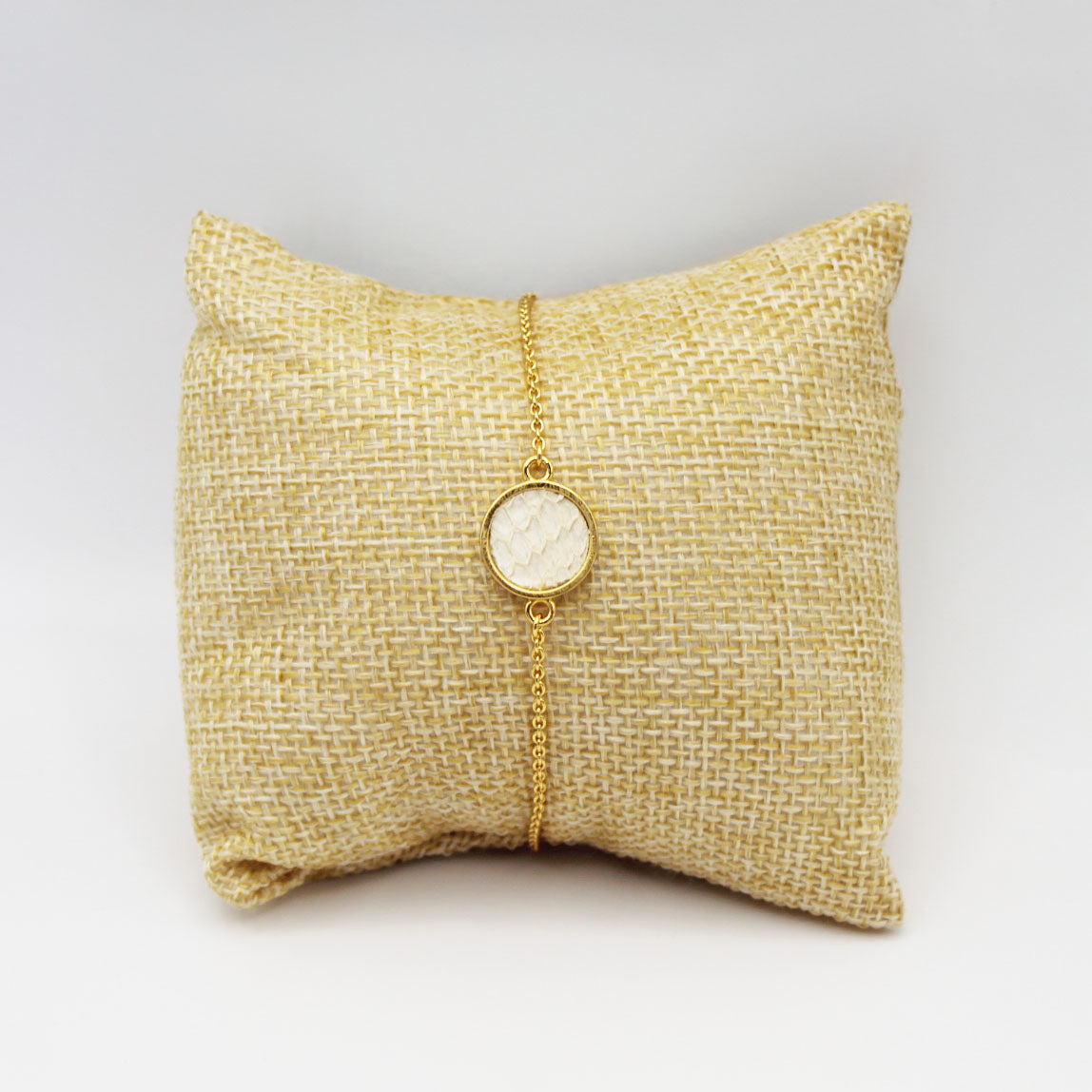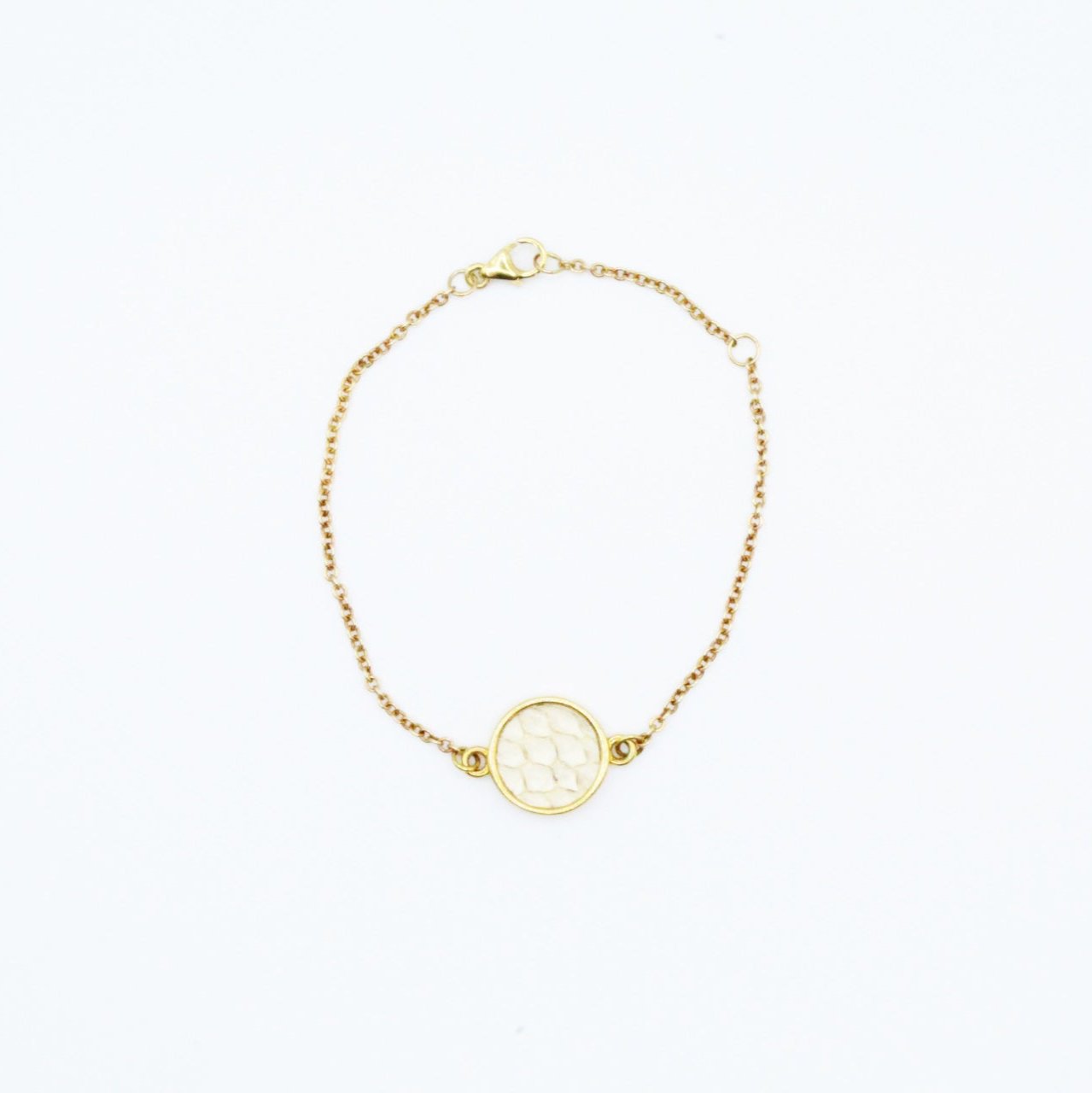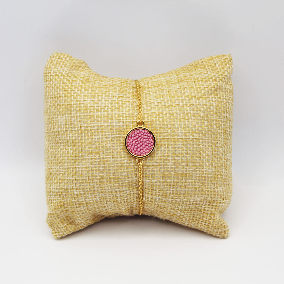Experience the exquisite elegance of the Cooper Bracelet. Crafted with a sterling silver or 18k gold filled chain and adorned with a round leather mark filled with luxurious stingray or fish skin. This adjustable 6-8 inch bracelet is the perfect accessory for any occasion. Elevate your style with the Cooper Bracelet today.