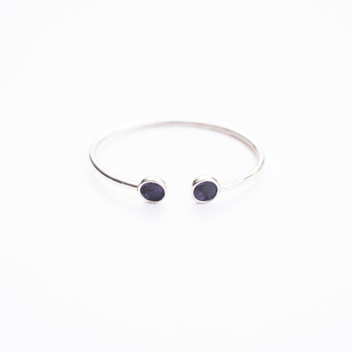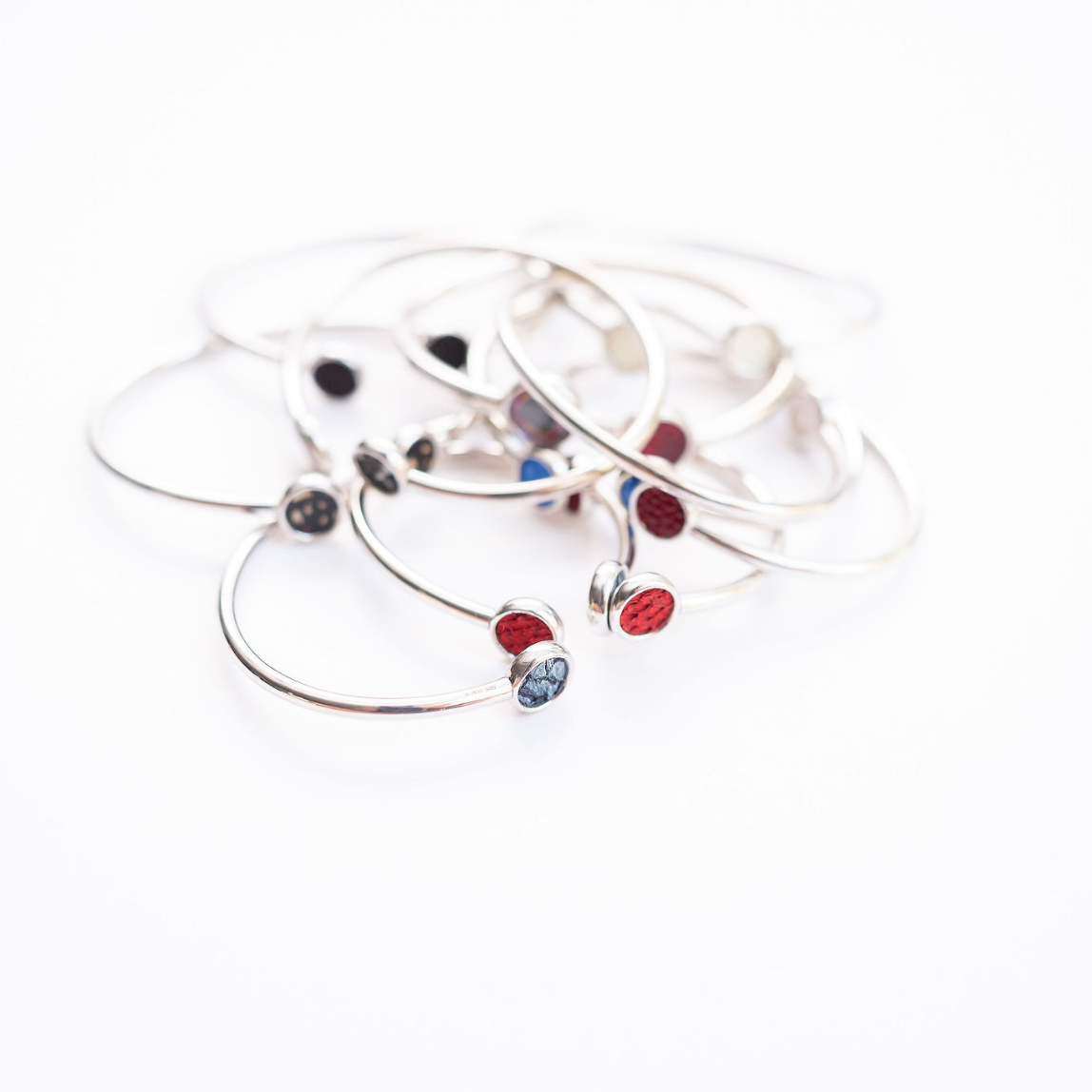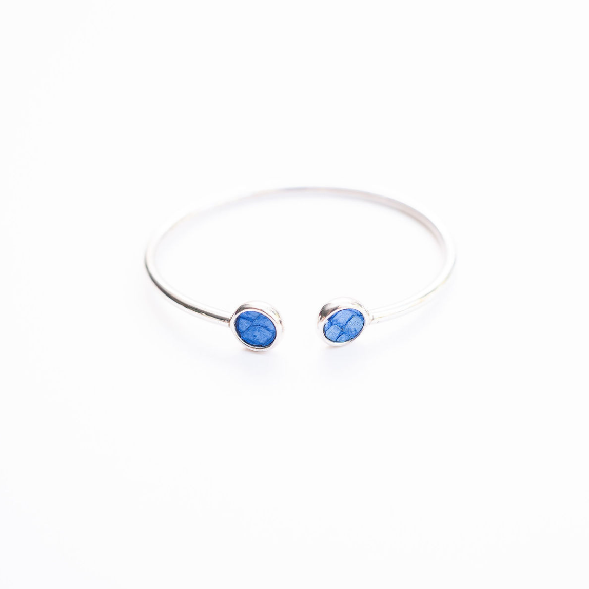 The Sandy Bay Cuff exudes a gracefully dainty cuff adorned with two bezel-set fish leather circles at each end, adding a touch of coastal elegance to your wrist.