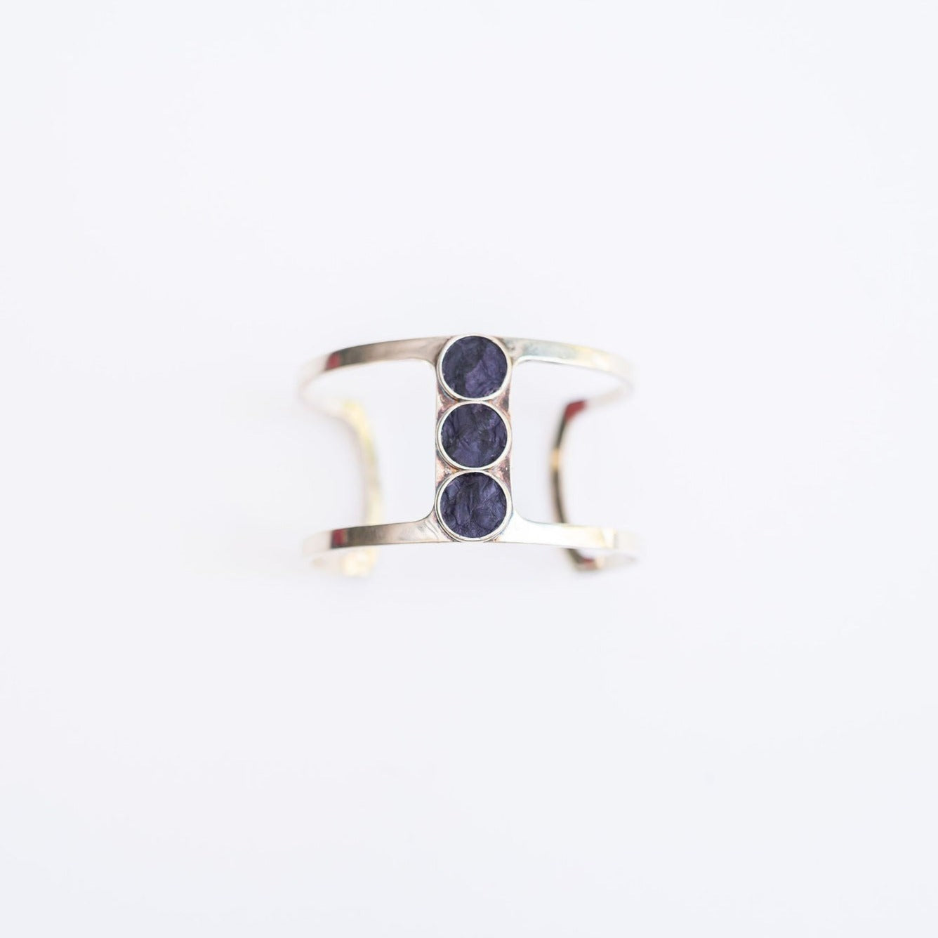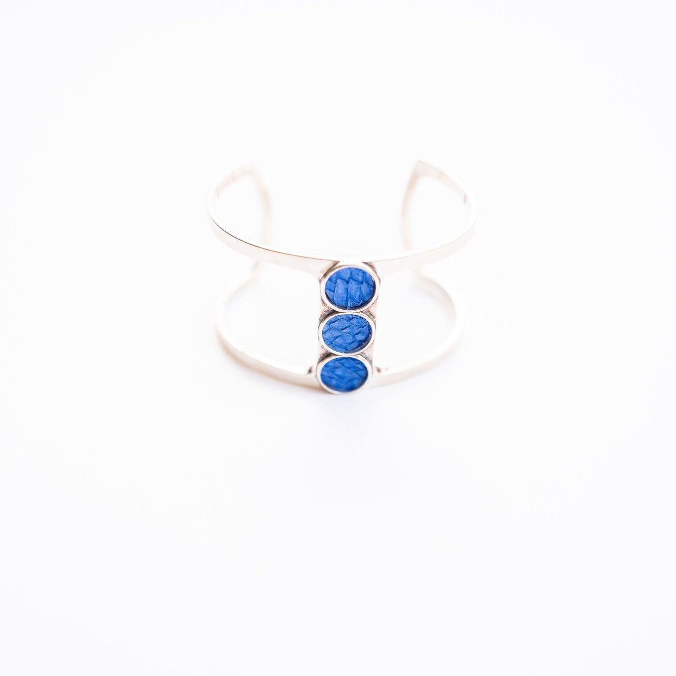 The Toogoodoo Cuff is a uniquely elegant piece featuring three centered bezels adorned with vibrant, colorful fish leather, infusing a hint of personal flair into your outfit.