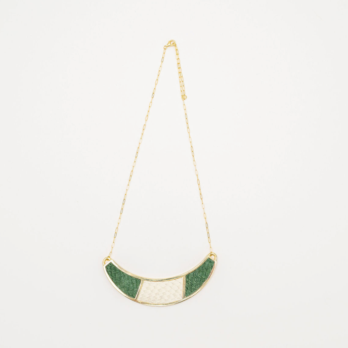 The Santee Necklace is a striking piece featuring a bold half-moon shape, adorned with elegant two-color fish leather design. This necklace is a unique fusion of bold design and refined craftsmanship, making it a standout accessory for any occasion. Chain length: 12-14 inches