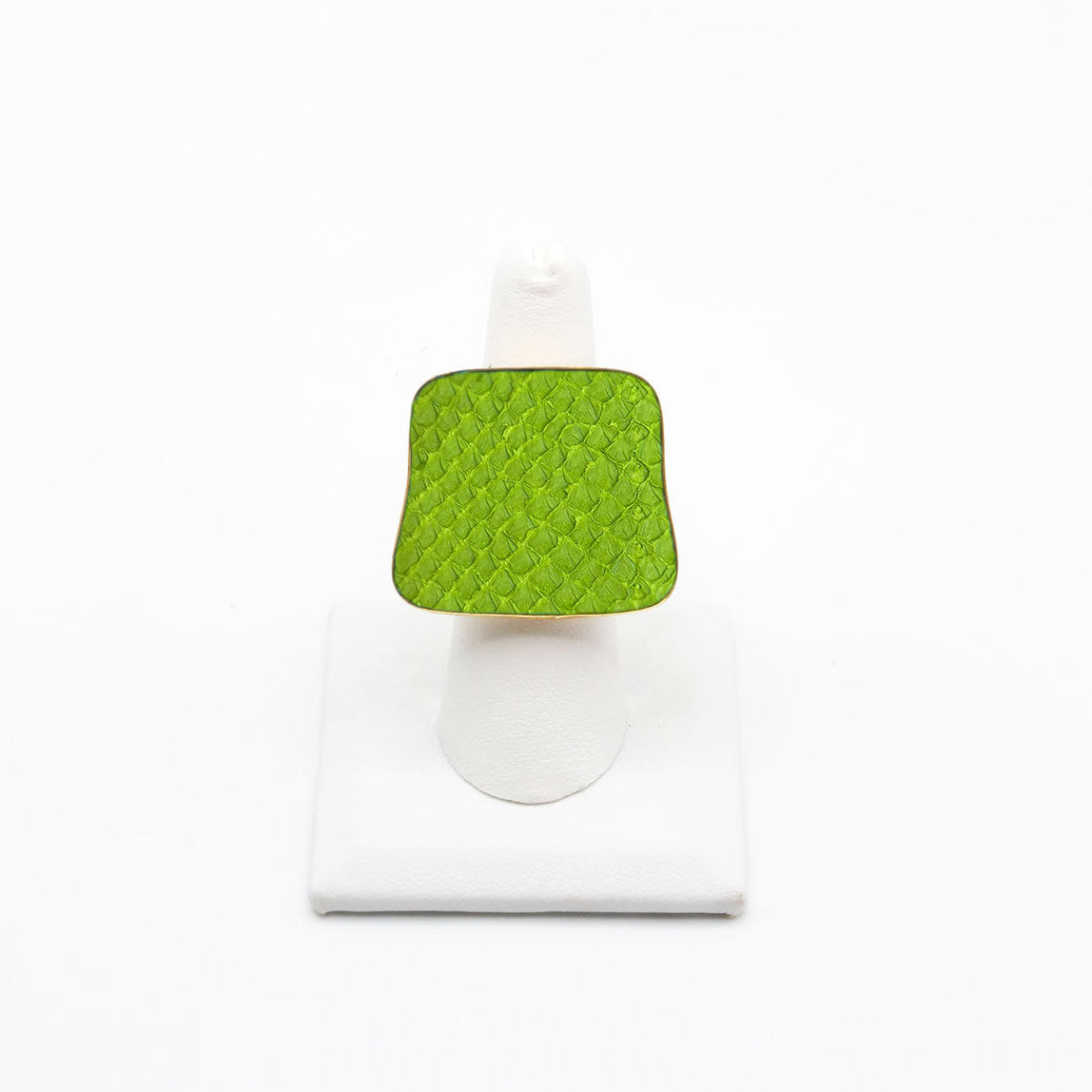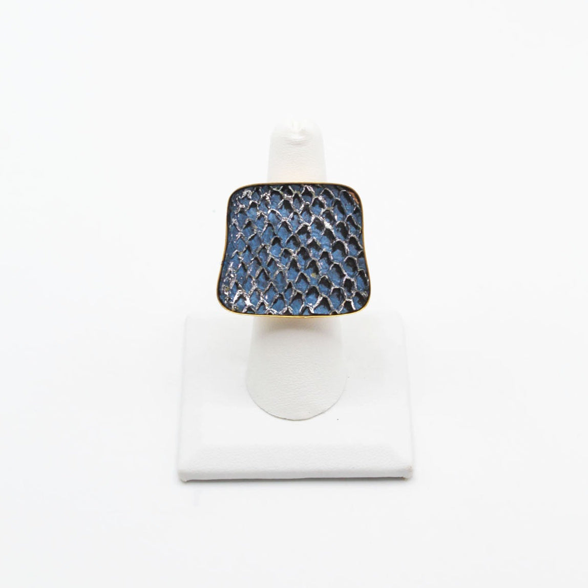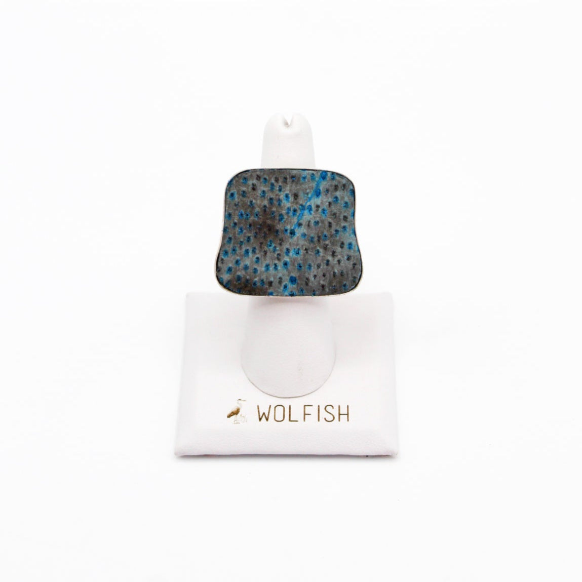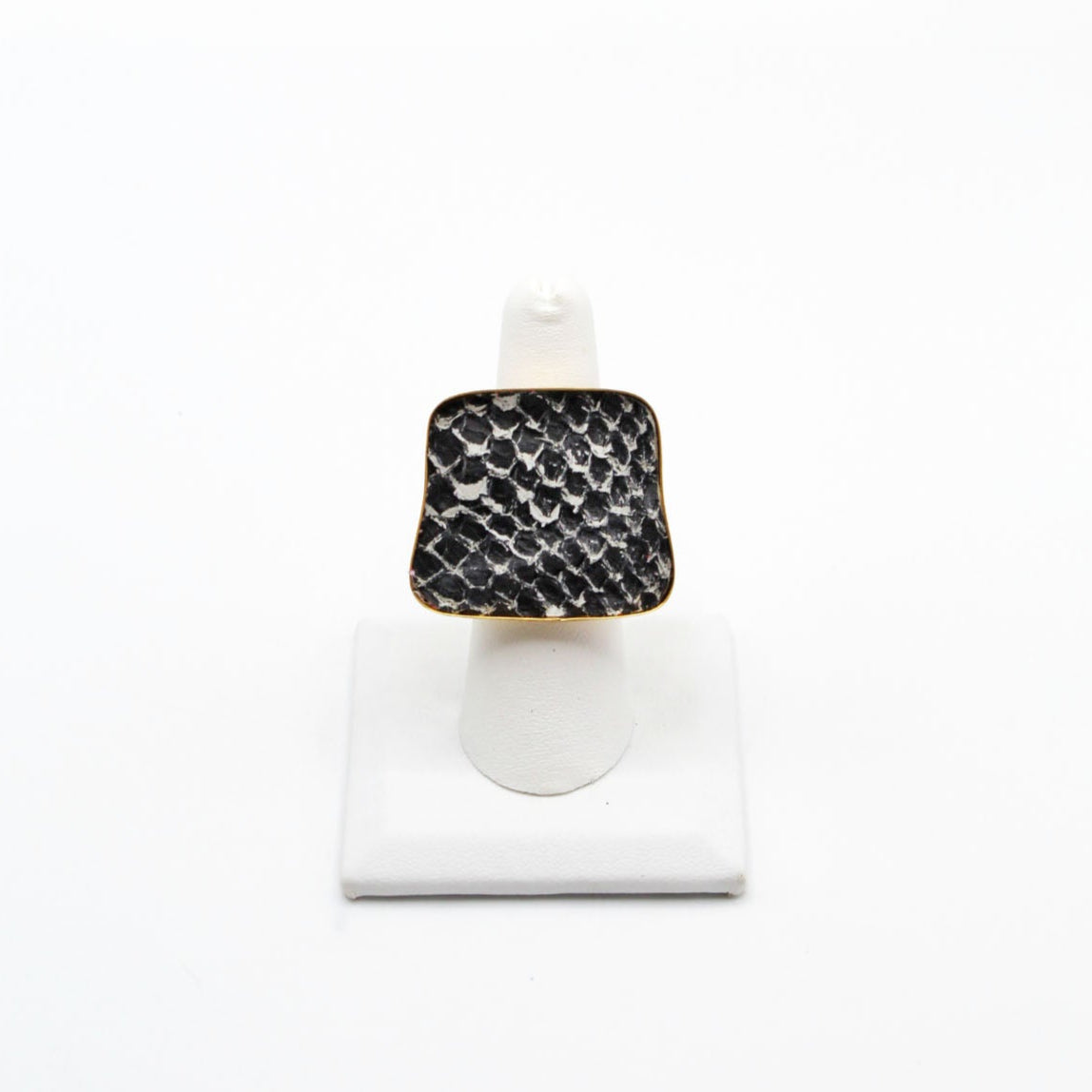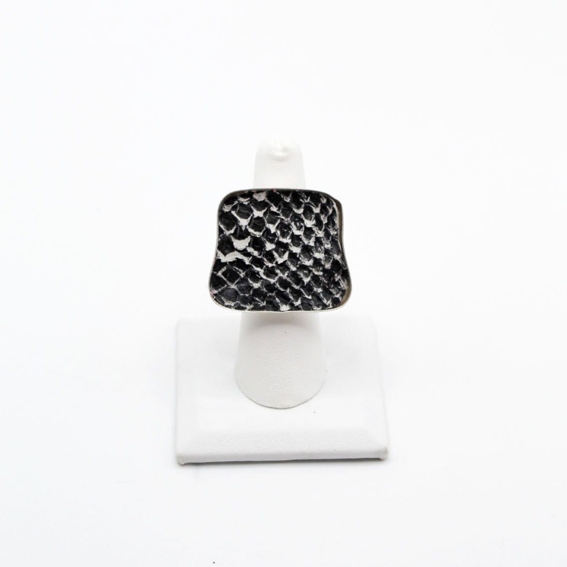 A true statement piece, this bold ring features a large, eye-catching frame filled with vibrant, textured fish leather that steals the spotlight. Designed to stand out, the Brazos balances modern edge with organic elegance, making it the perfect piece to elevate any look. Surface width: 1 3/16"
