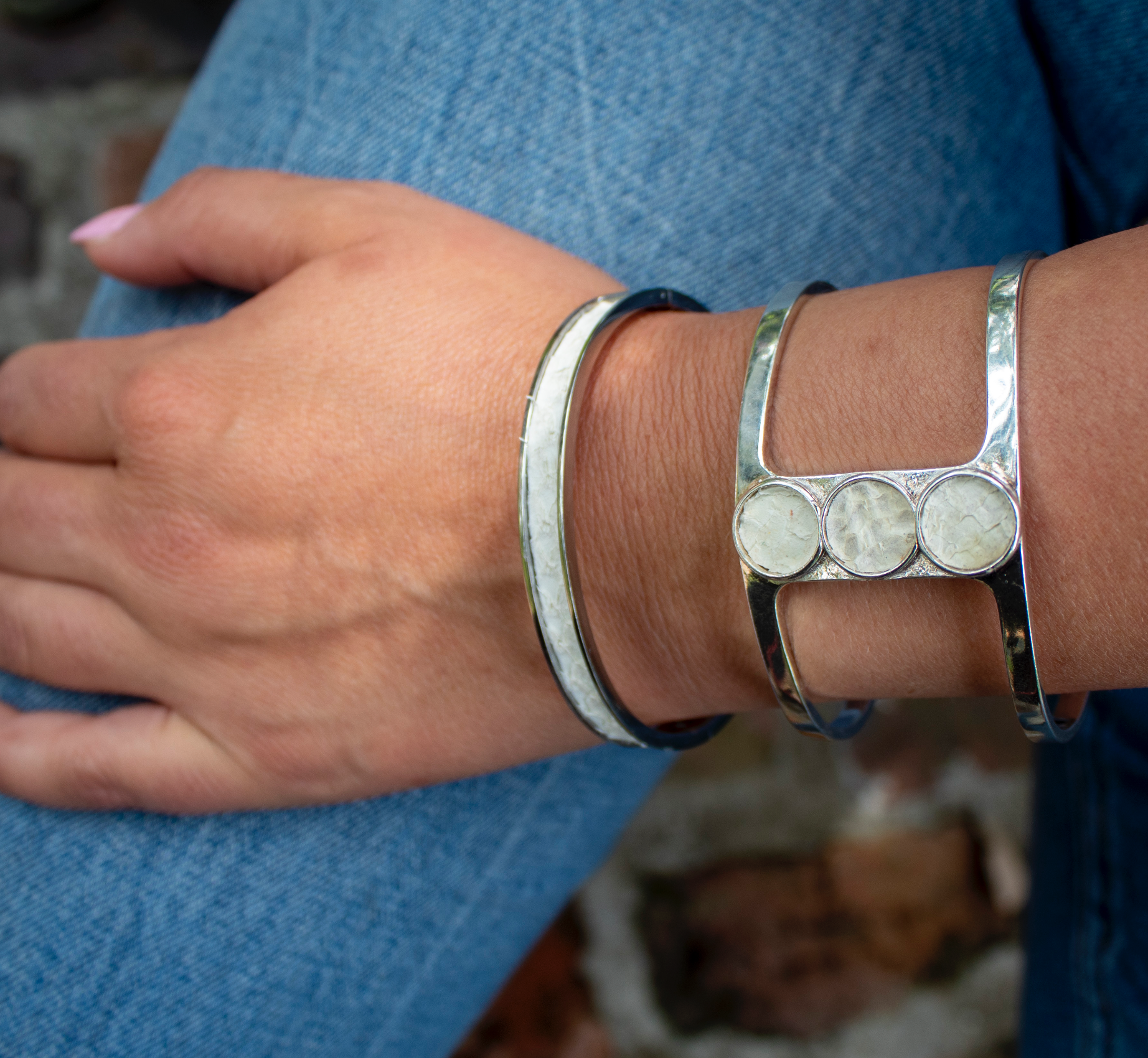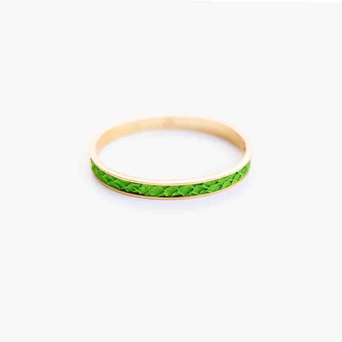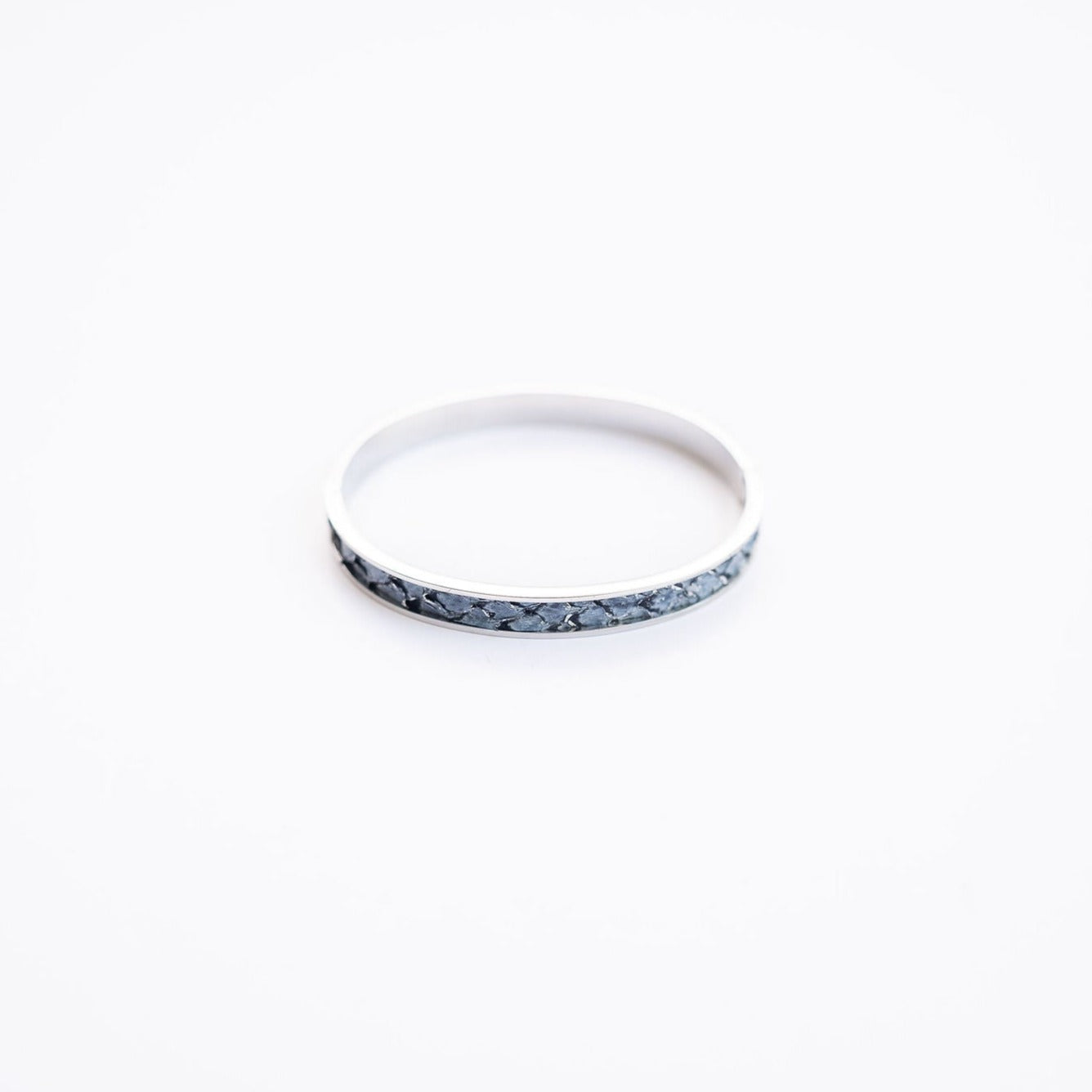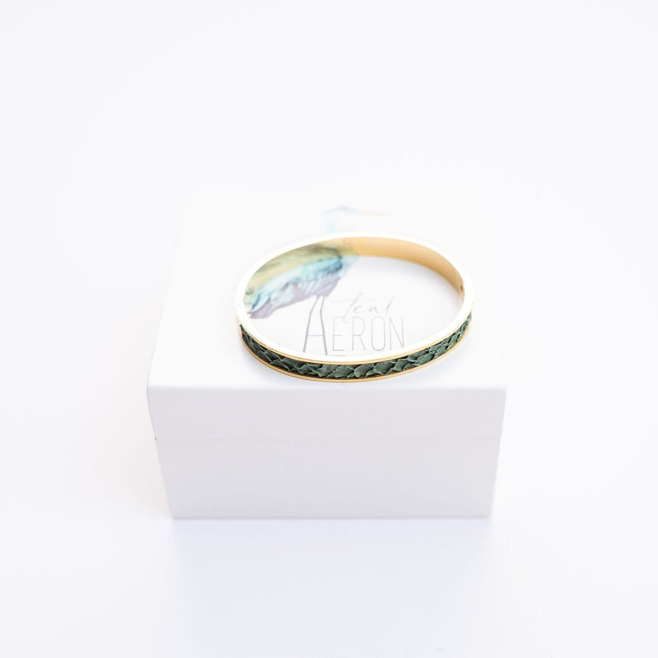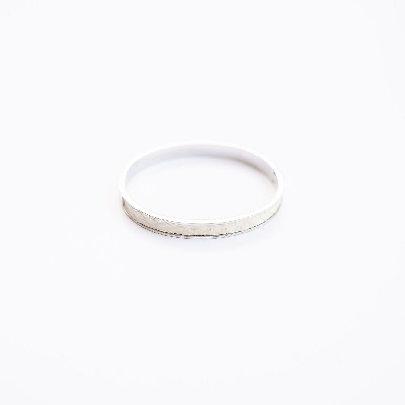 The Kiawah Bangle features a delicate design that seamlessly blends the exotic charm of fish leather with a chic and adaptable bangle style.