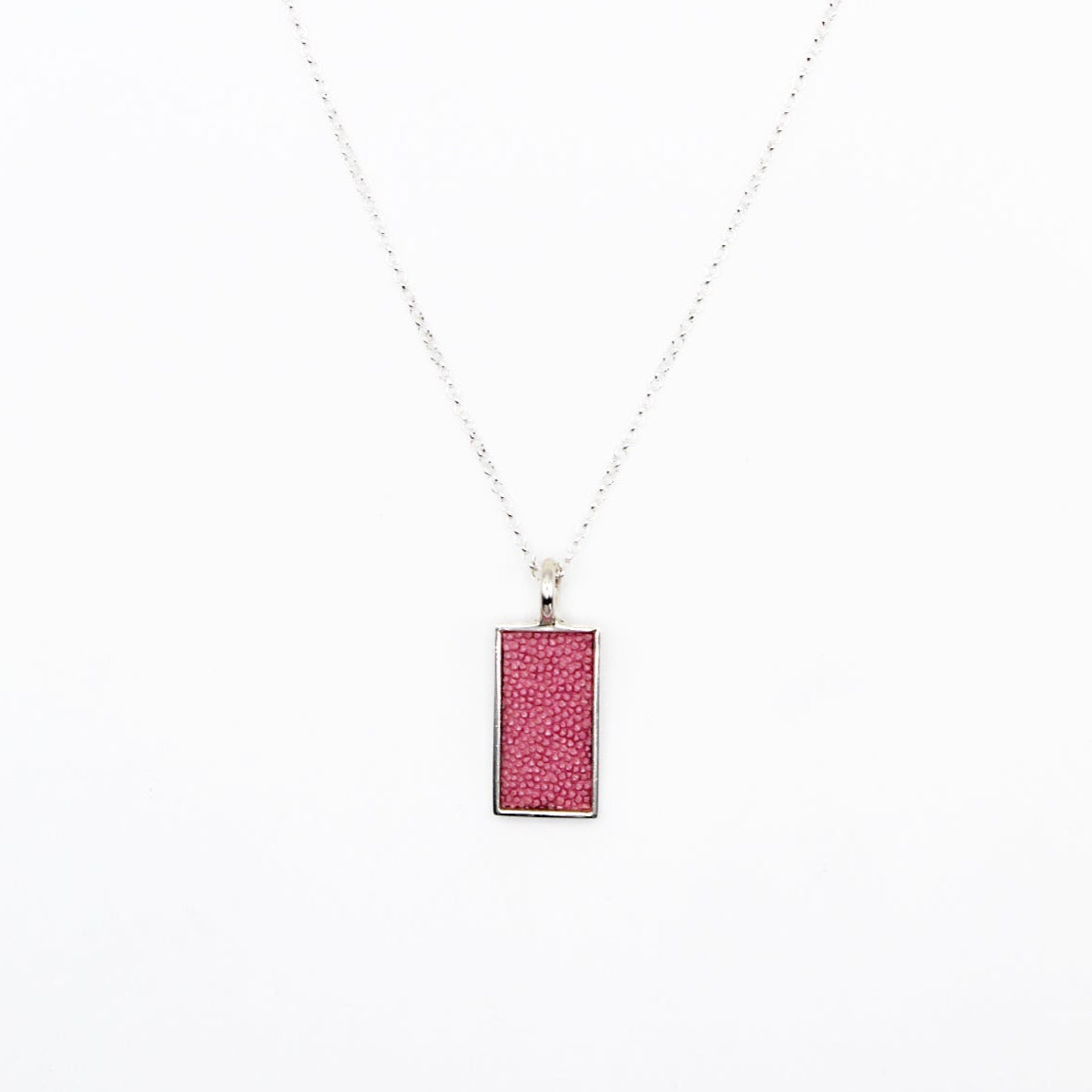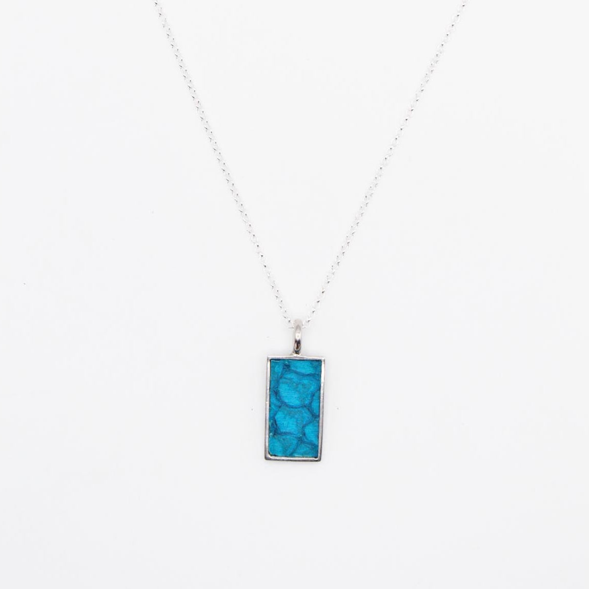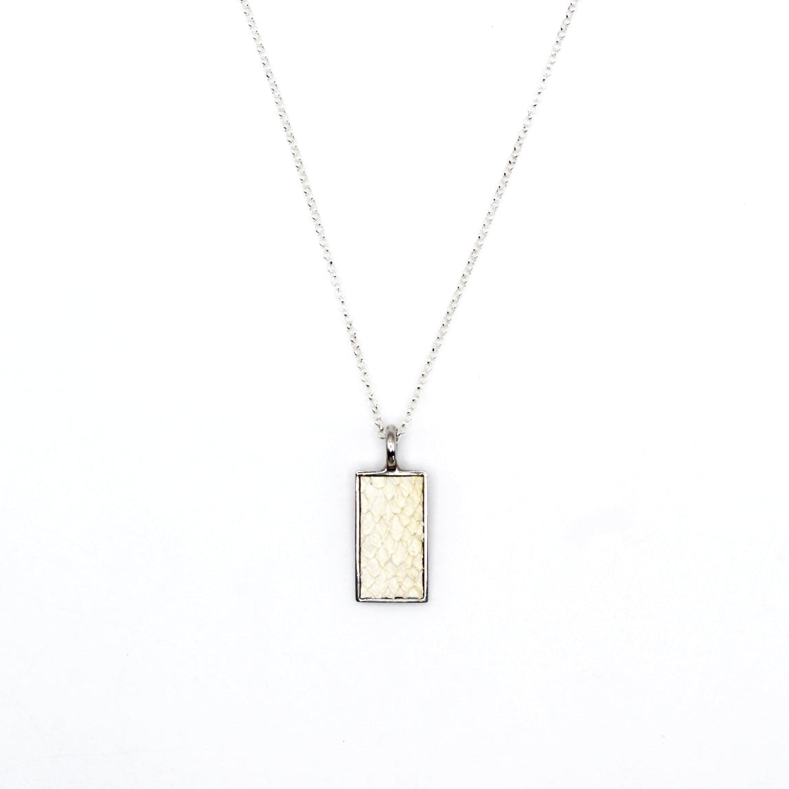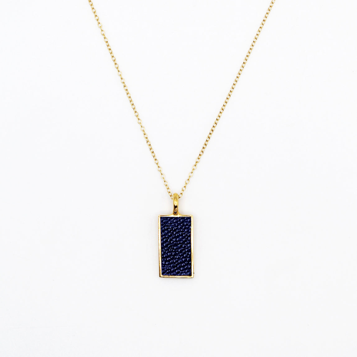 The stunning Saluda Necklace features an adjustable chain made with sterling silver or gold filled, allowing you to wear it at any length between 12-24 inches. The vertical rectangle design is complimented by a unique fish or stingray leather insert, making it a truly one of a kind accessory. Elevate any outfit with this bold and stylish necklace.