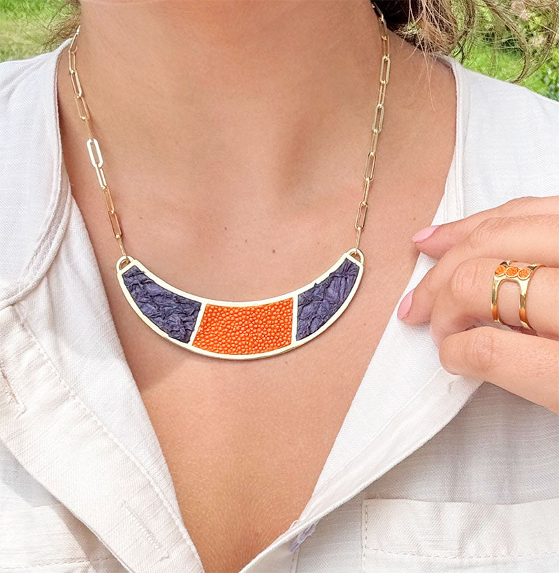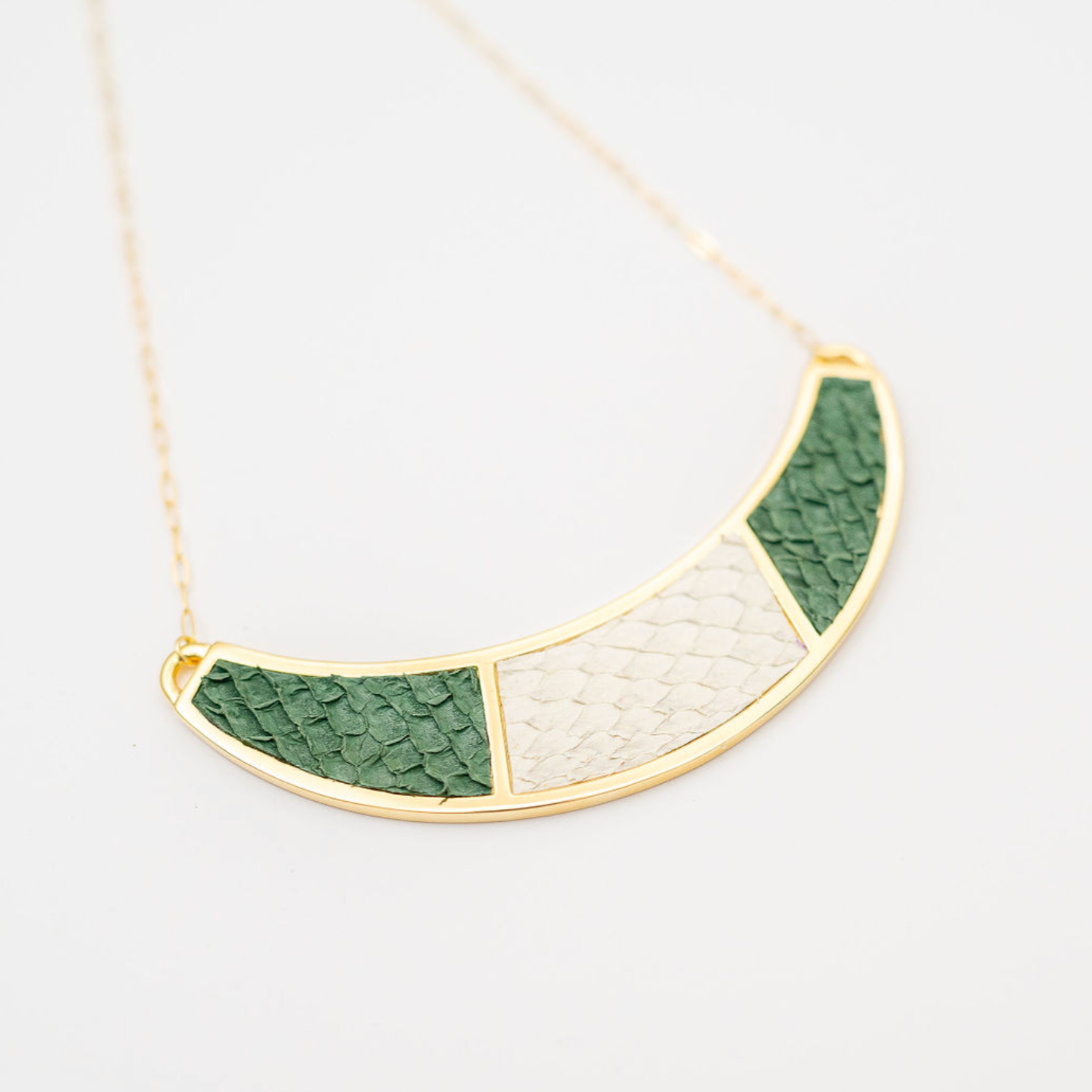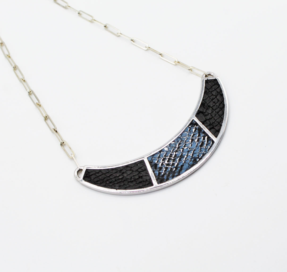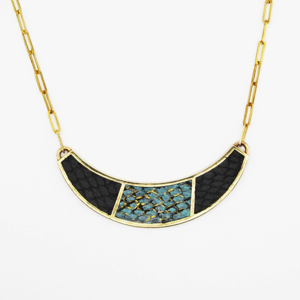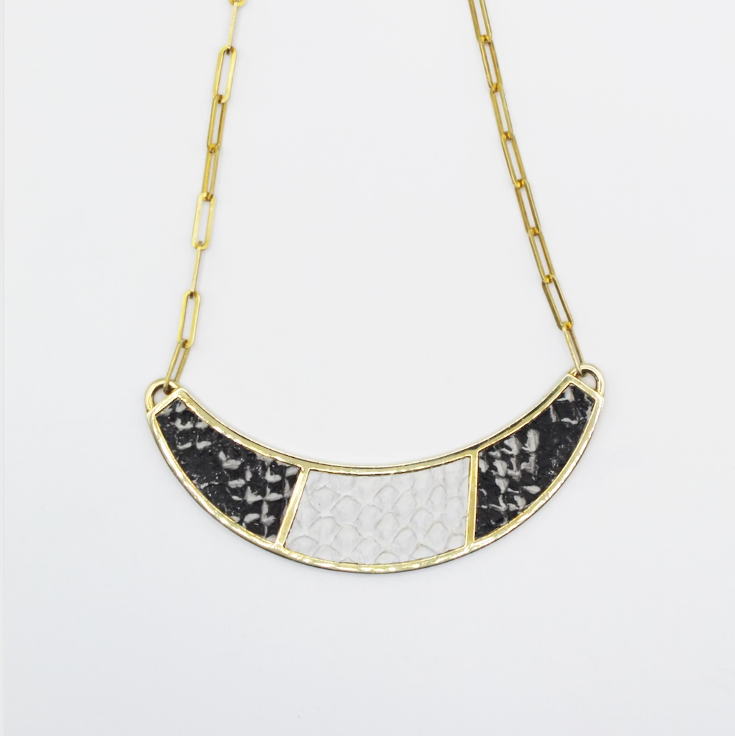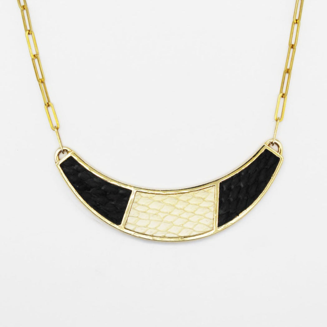 The Santee Necklace is a striking piece featuring a bold half-moon shape, adorned with elegant two-color fish leather design. This necklace is a unique fusion of bold design and refined craftsmanship, making it a standout accessory for any occasion. Chain length: 12-14 inches