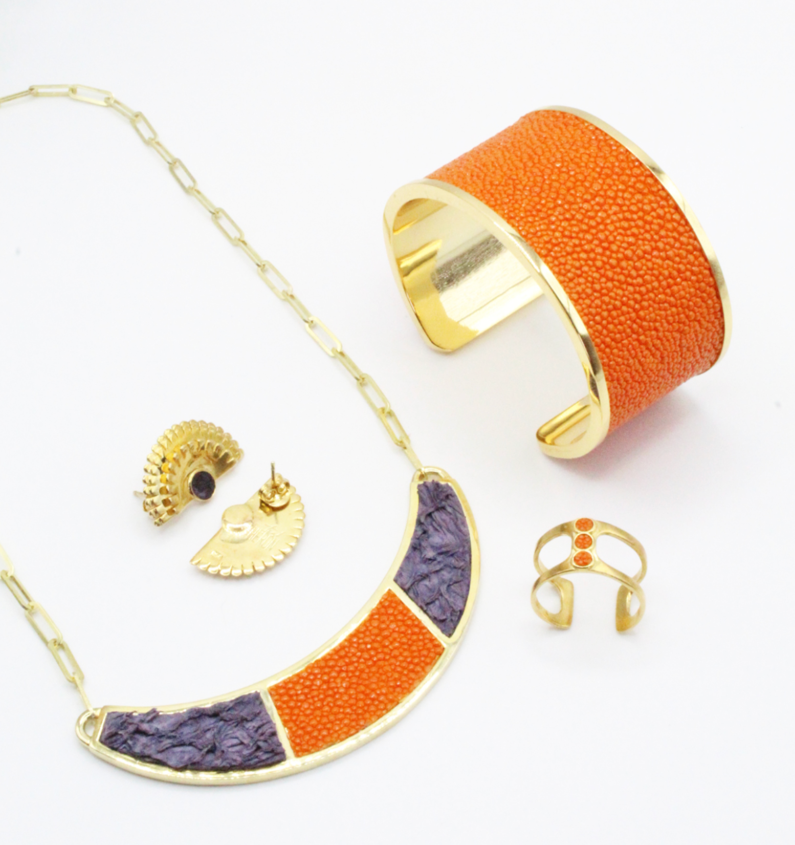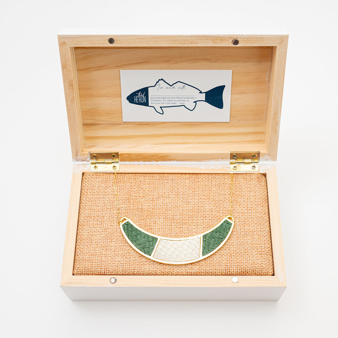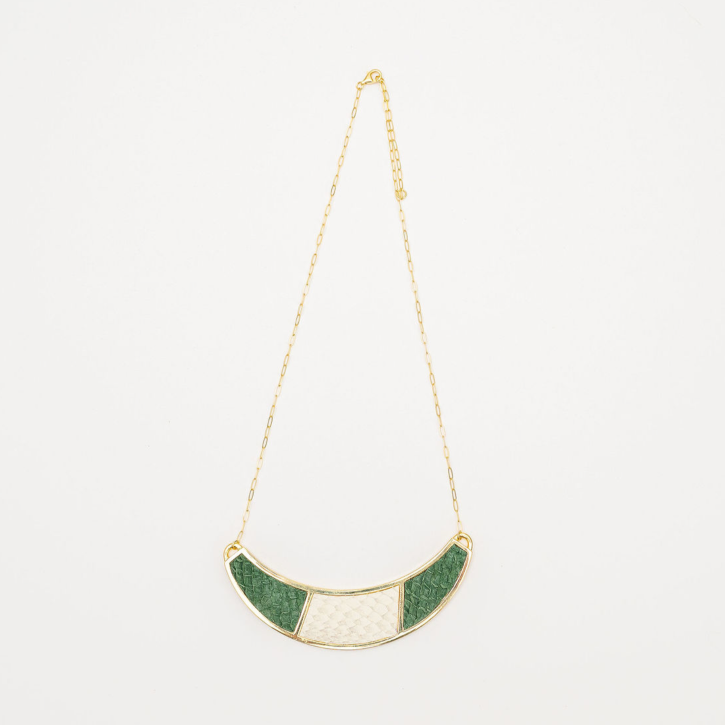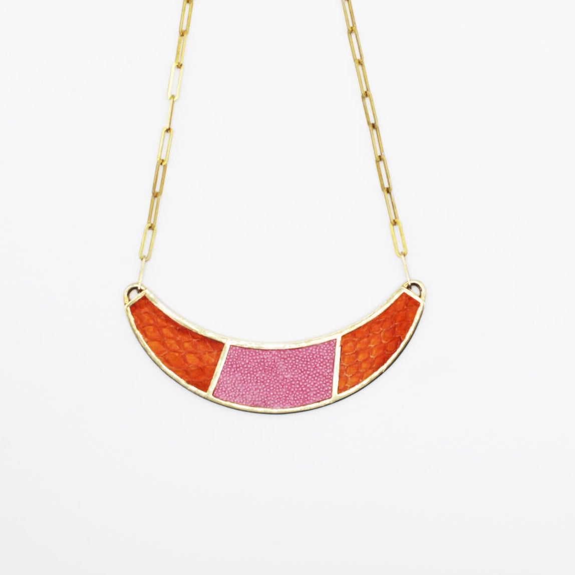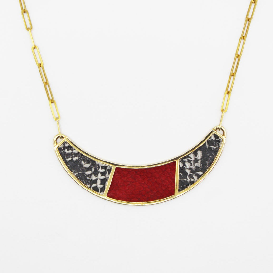 The Santee Necklace is a striking piece featuring a bold half-moon shape, adorned with elegant two-color fish leather design. This necklace is a unique fusion of bold design and refined craftsmanship, making it a standout accessory for any occasion. Chain length: 12-14 inches