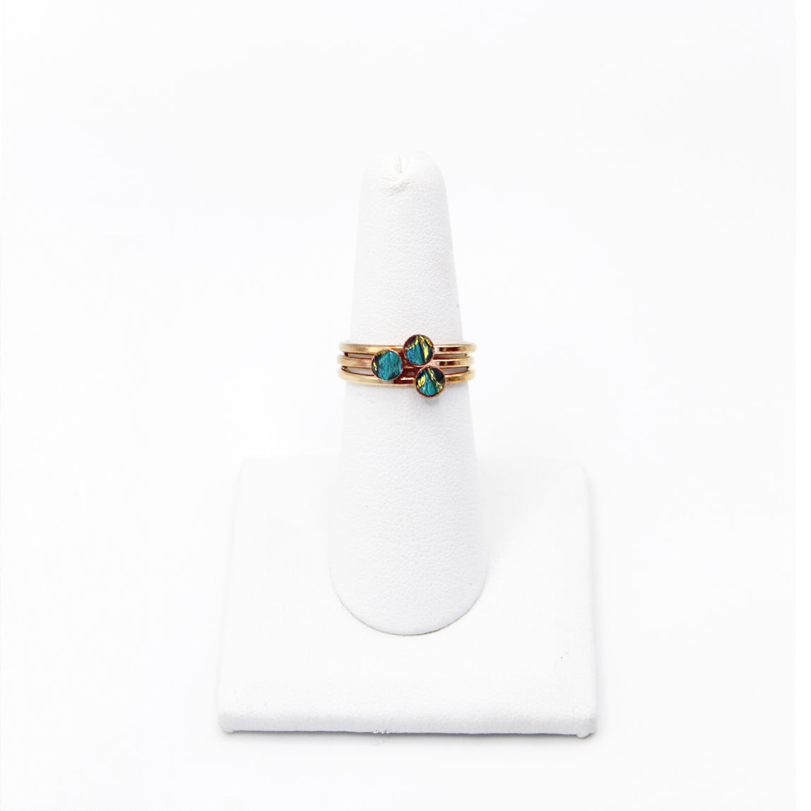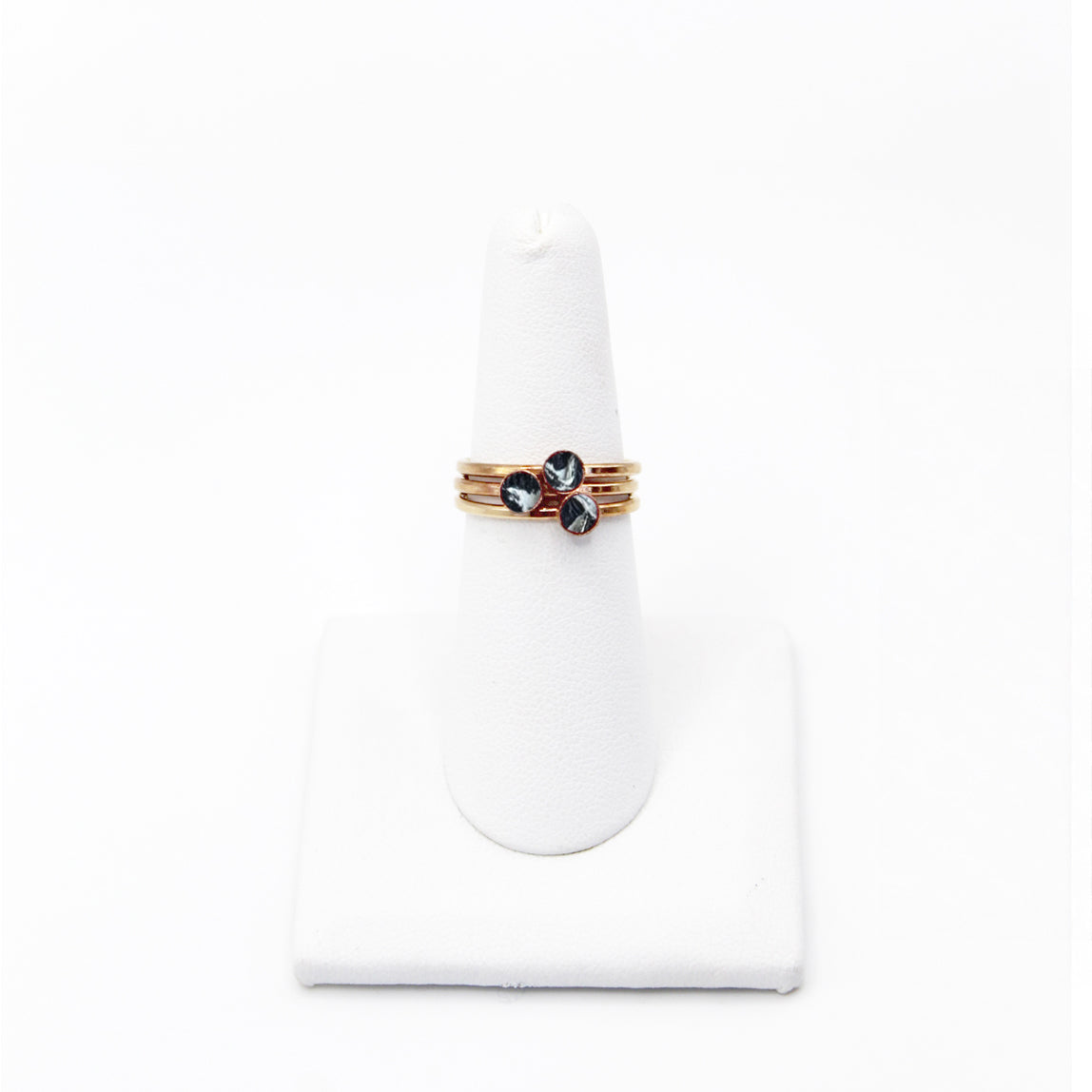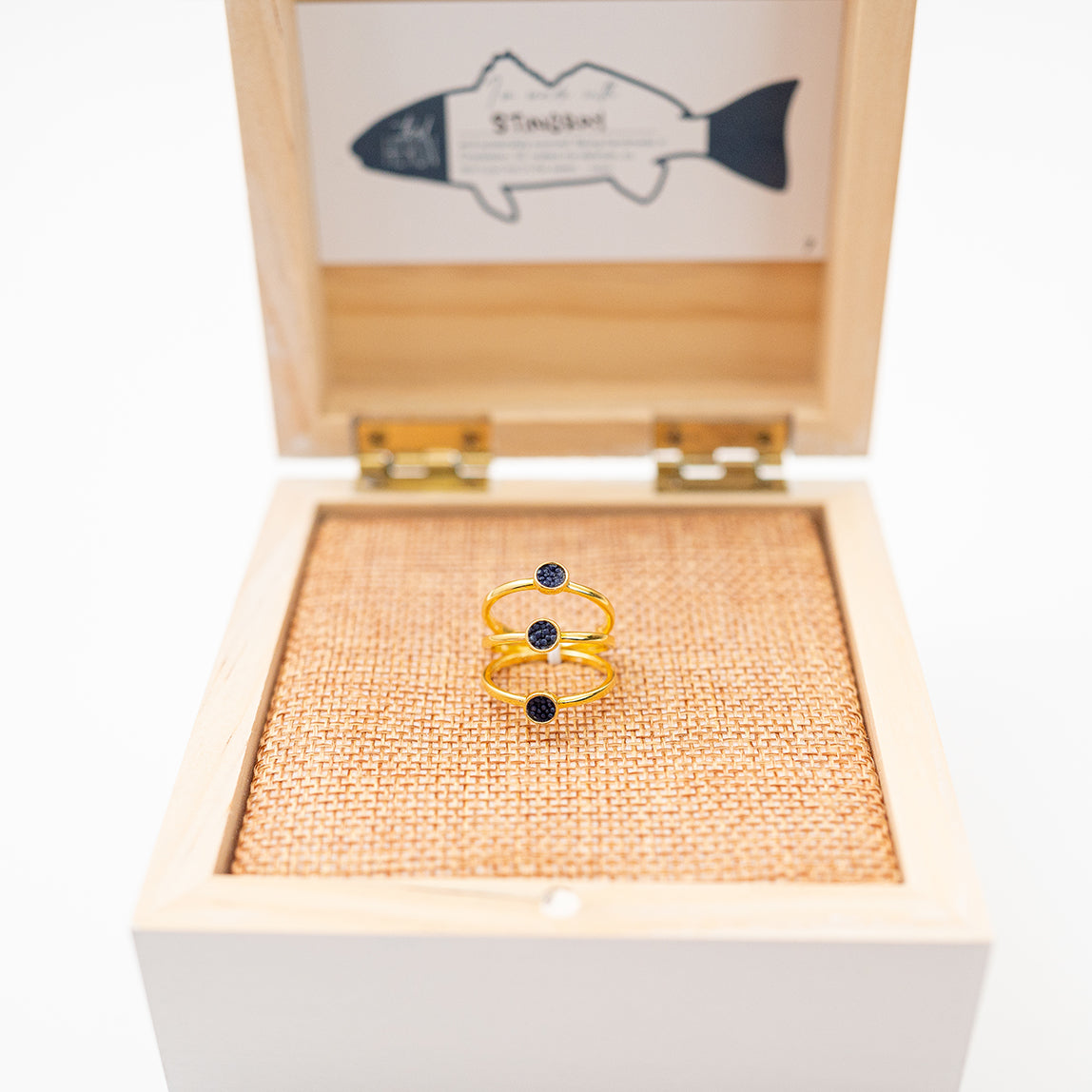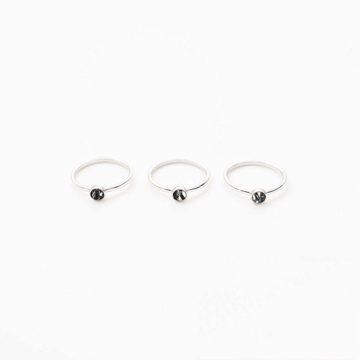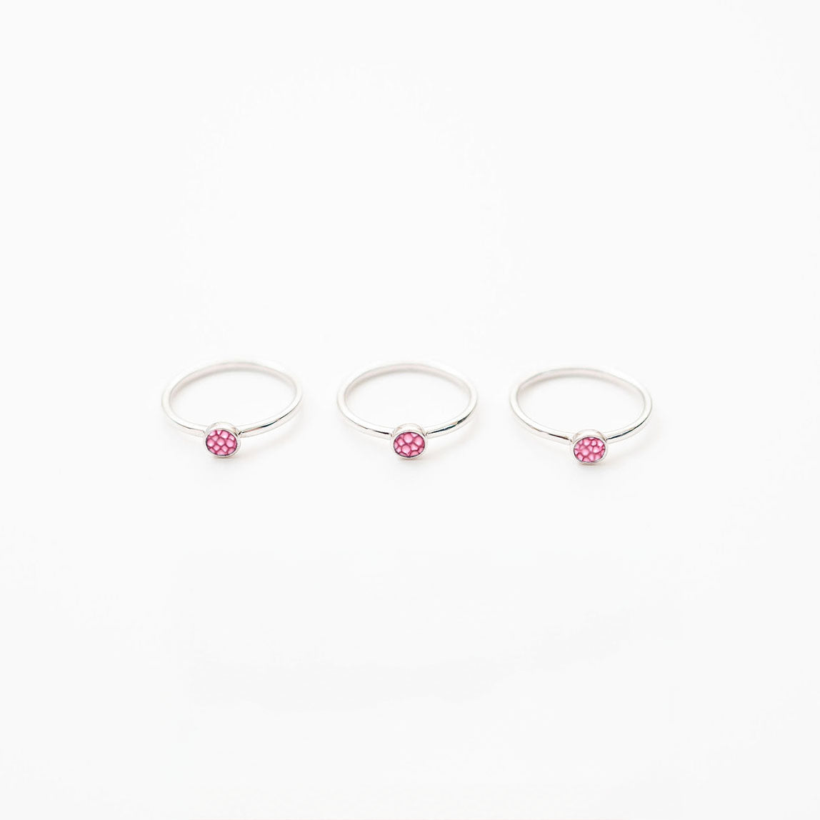 Introducing the Tyger Ring Set, a group of three dainty rings all with a single bezel featuring distinctive fish leather and/or fish eyes. Discover a touch of luxury and uniqueness in every piece.